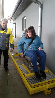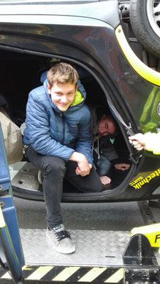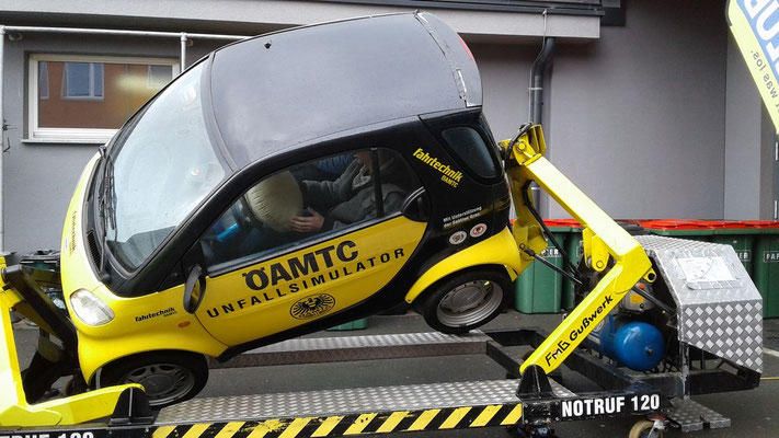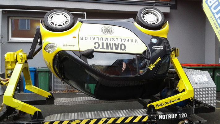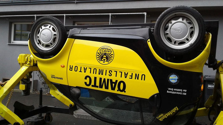 Das Highlight an diesem Tag war der Überschlagsimulator. Es handelt sich dabei um ein drehbares Auto, mit dem Maßnahmen zur Befreiung aus einem Auto nach einem Unfall erlernt werden