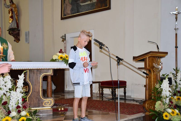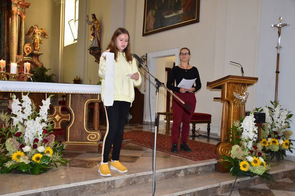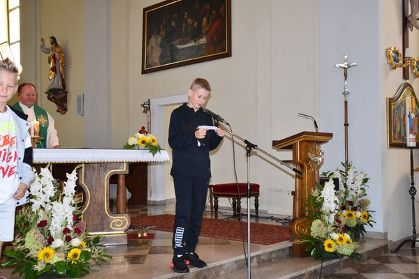 Sechs Mädchen aus der 1.Klasse präsentierten verschiedene Kopfbedeckungen (Sonnenhut, Haube, Radhelm, …) die uns im Alltag schützen können. Acht Jungs und Mädchen lasen Texte und Fürbitten für ein gutes, wenn auch ungewöhnliches, Schuljahr.