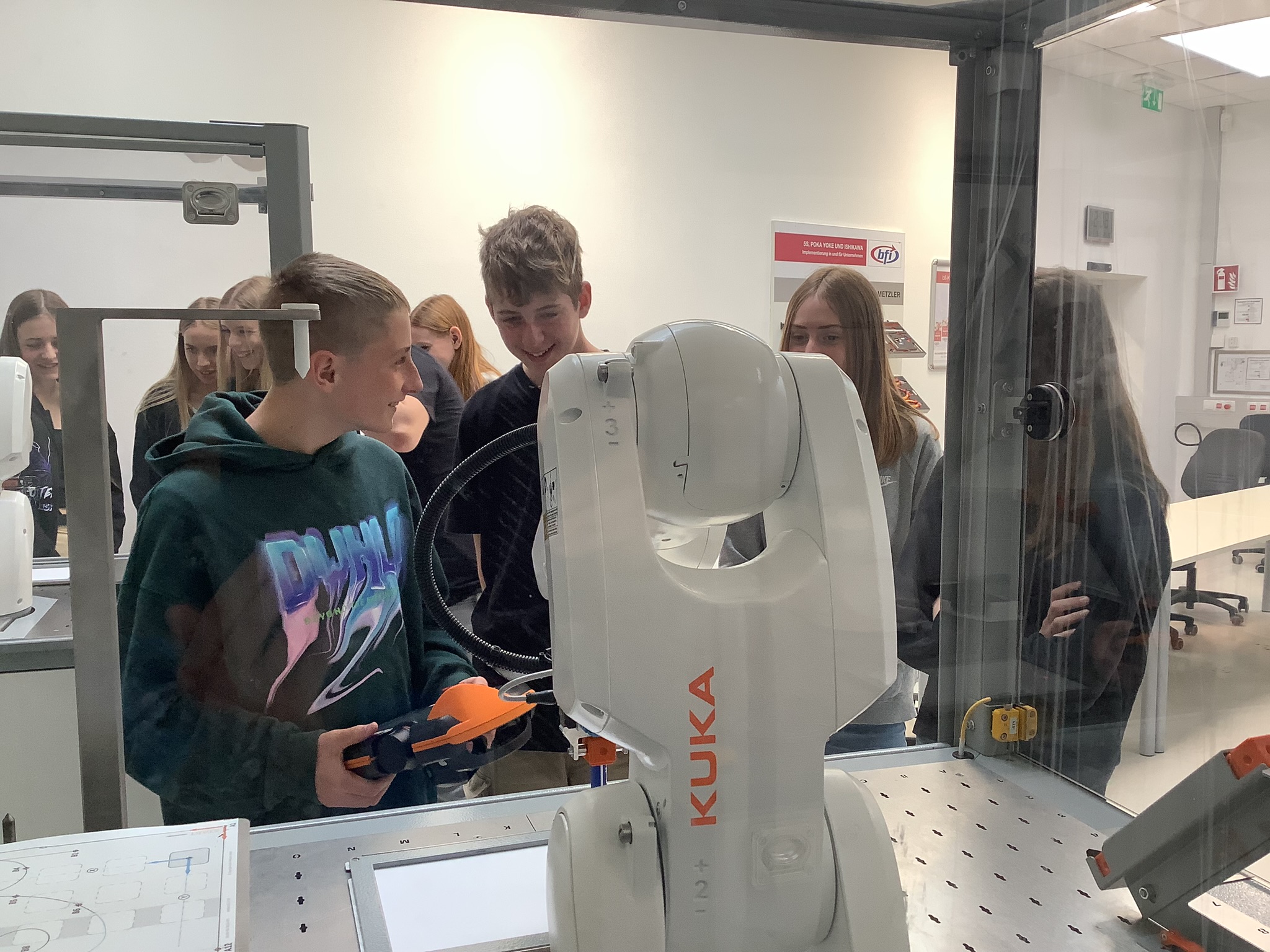 Der abwechslungsreiche Vormittag bot viel. Neben einem Vortrag über den Standort, erhielten wir Einblicke in die Programmierung und die Aufgaben von Robotern. Der sichere Umgang mit Industrierobotern und der grundlegende Aufbau eines Robotersystems wurde ebenso thematisiert wie auch die Geschwindigkeit, mit der sie arbeiten können. Diese wurde uns auch eindrucksvoll vorgeführt.