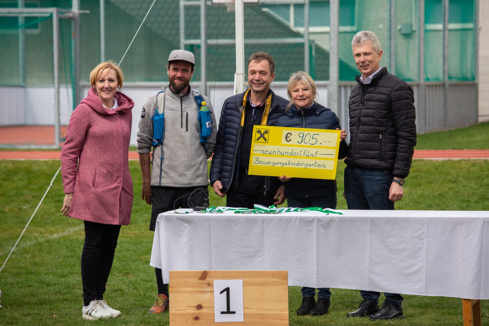 Für jeden gelaufenen Kilometer der Kinder wurde fleißig gespendet – beim Überqueren der Ziellinie wurde dieser Spendenbetrag dann wirksam, was ein wunderbares Gefühl für jedes Kind war. Ein ganz großes Dankeschön ergeht an alle Eltern und Erziehungsberechtigen, die diesen Tag mit ihren Spenden und ihrer Unterstützung zu einem wundervollen gemacht haben. Zudem konnten zahlreiche Sponsorenbeiträge entgegengenommen werden, wodurch ein ansehnlicher Spendenbeitrag von 905 € gesammelt werden konnte. Dieser Scheck wurde dem Bewegungskindergarten Gleinstätten, unter der Leitung von Barbara Habenbacher, bei der feierlichen Siegerehrung übergeben.