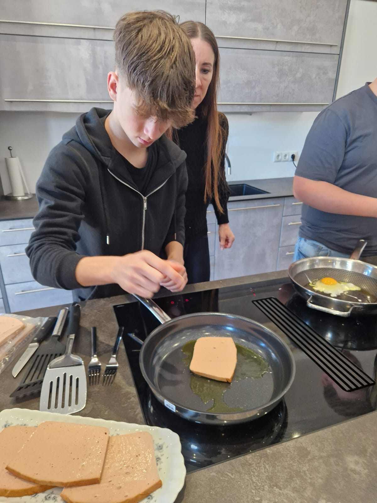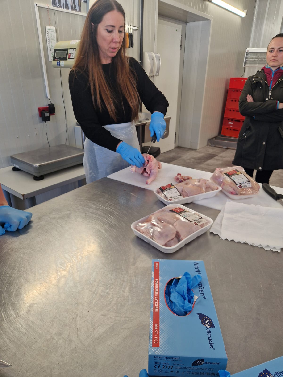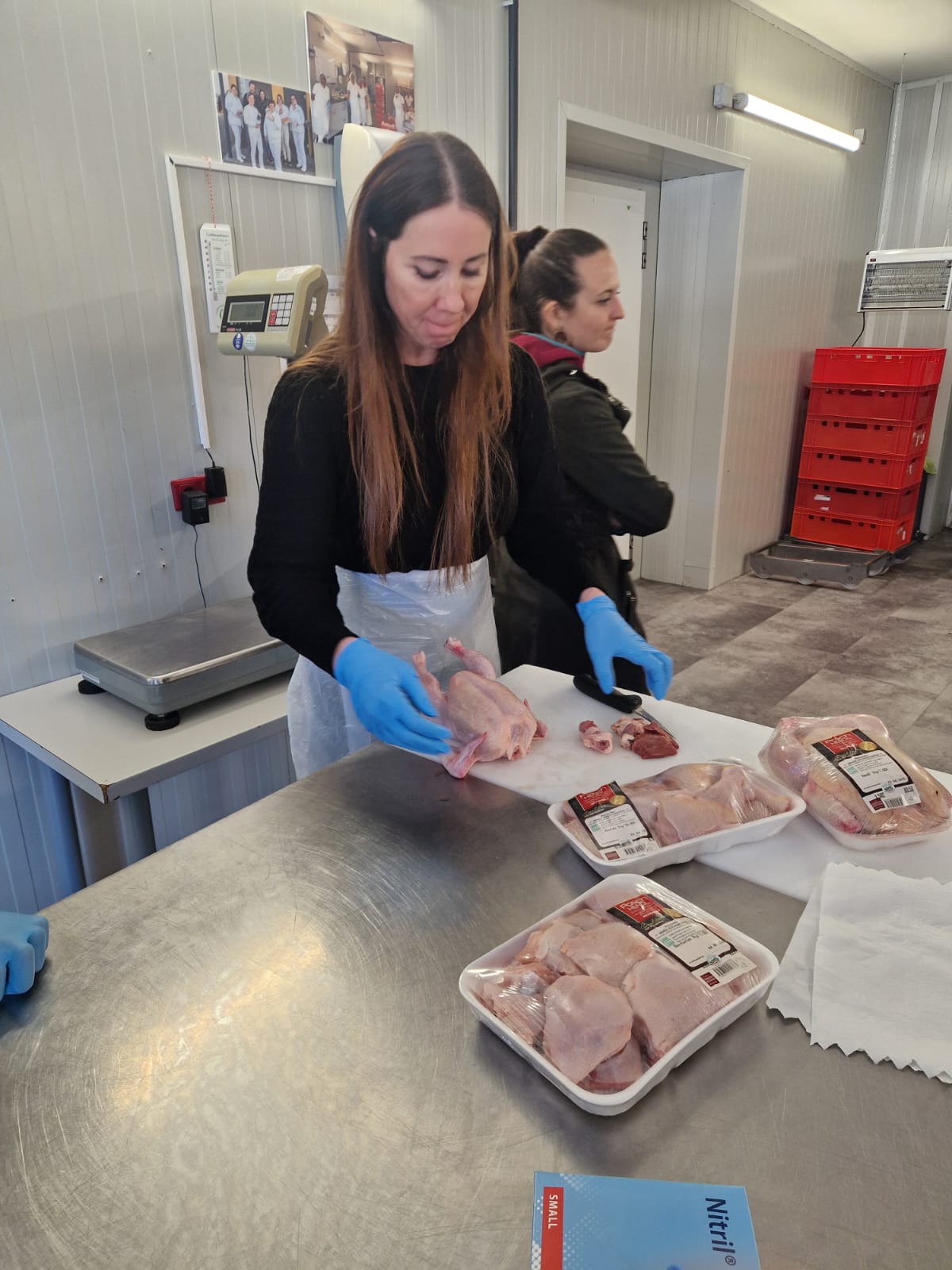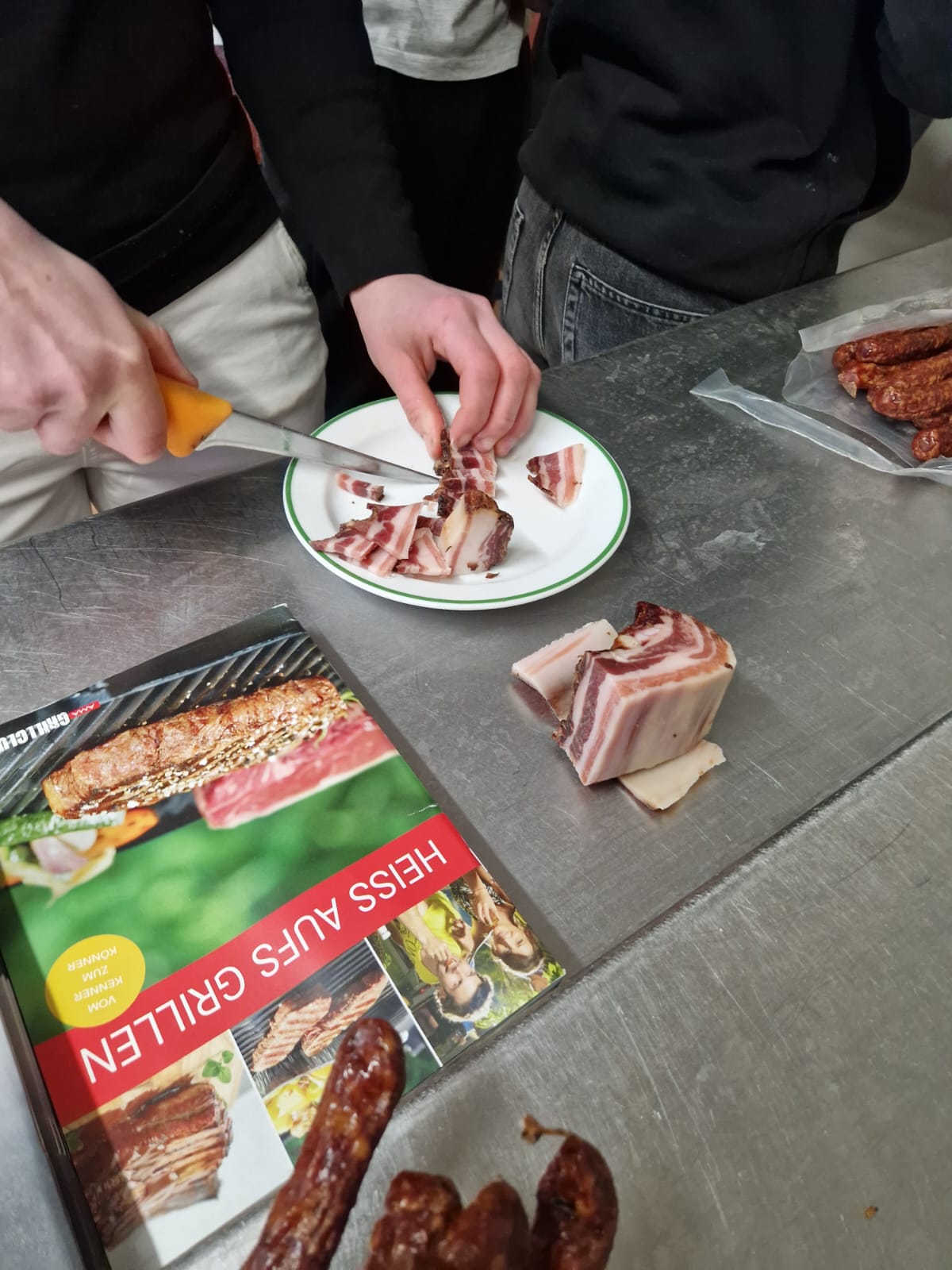 Besonders begeistert waren die Schüler:innen von der Möglichkeit, eine Vielzahl von Produkten wie Hendl, Leberkäse, Salami und Würsteln zu verkosten. Im Betrieb „Hendl Posch“ durften einige Schüler sogar ein bereits geschlachtetes Hendl fachgerecht zerlegen – eine Aufgabe, bei der insbesondere die Burschen mit großer Motivation dabei waren. Die frisch „gestohlenen“ Eier wurden zu köstlichen Spiegeleiern verarbeitet und genüsslich verspeist. In der „Fleischerei Posch“ erhielten die Schüler:innen einen faszinierenden Einblick in die verschiedenen Fleischarten eines Schweins und konnten den Schlachtraum besichtigen.