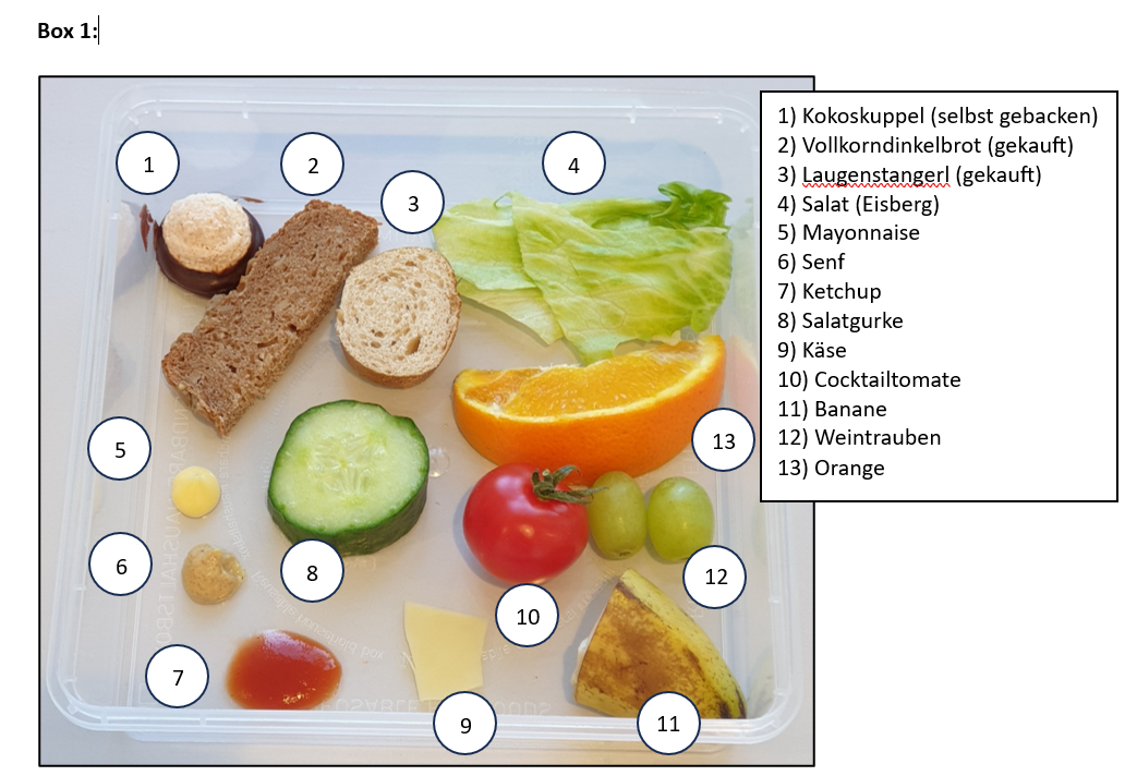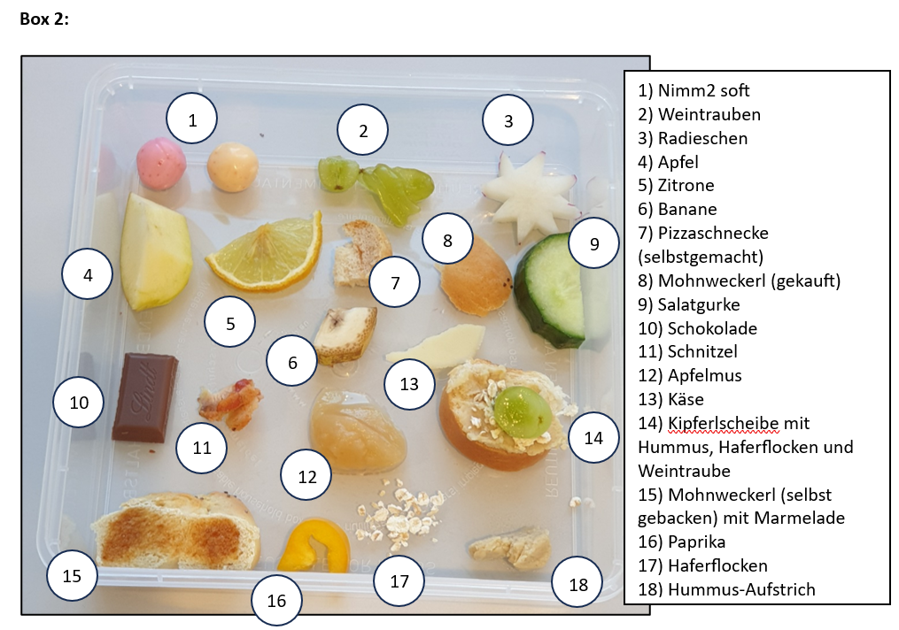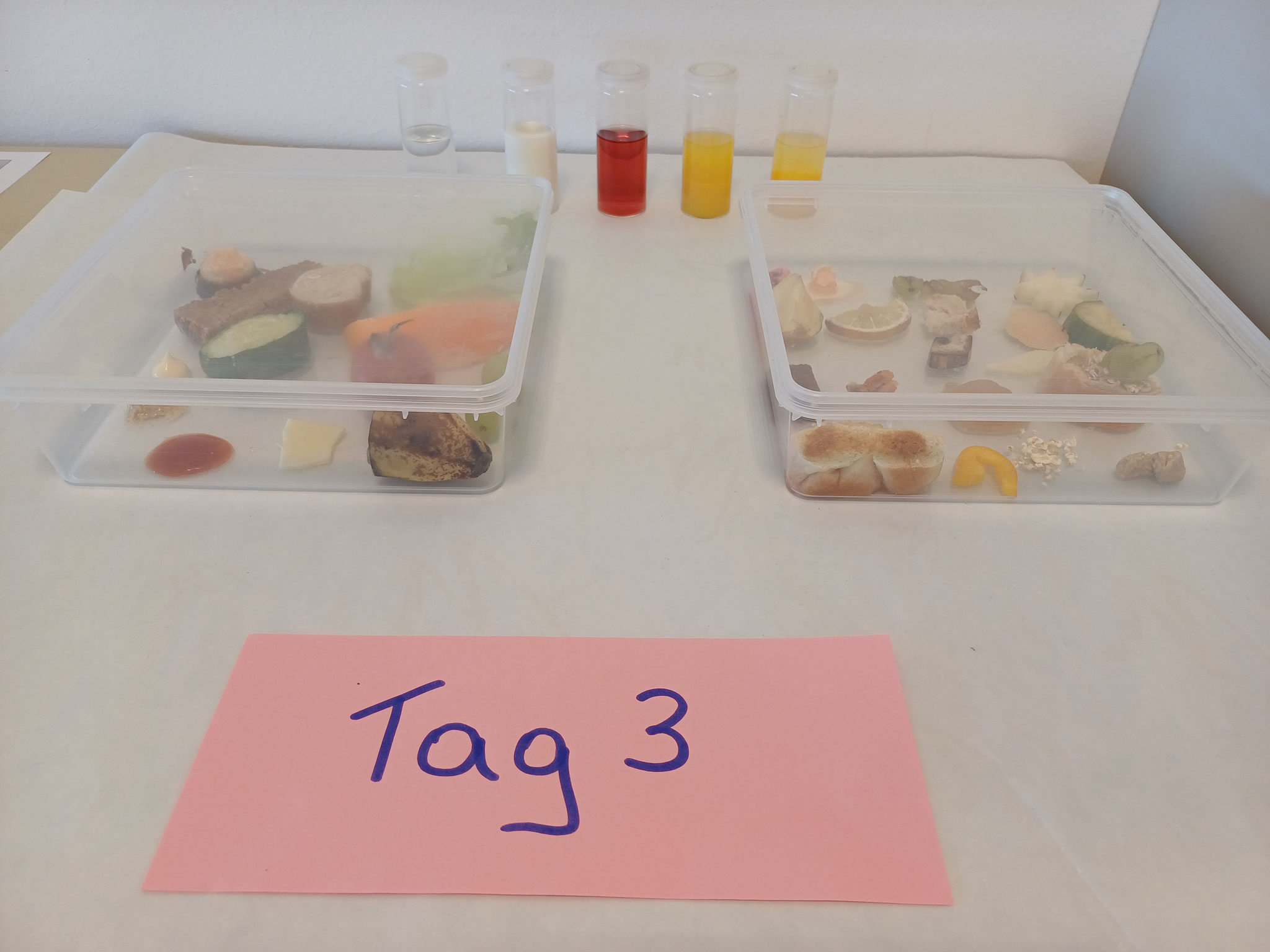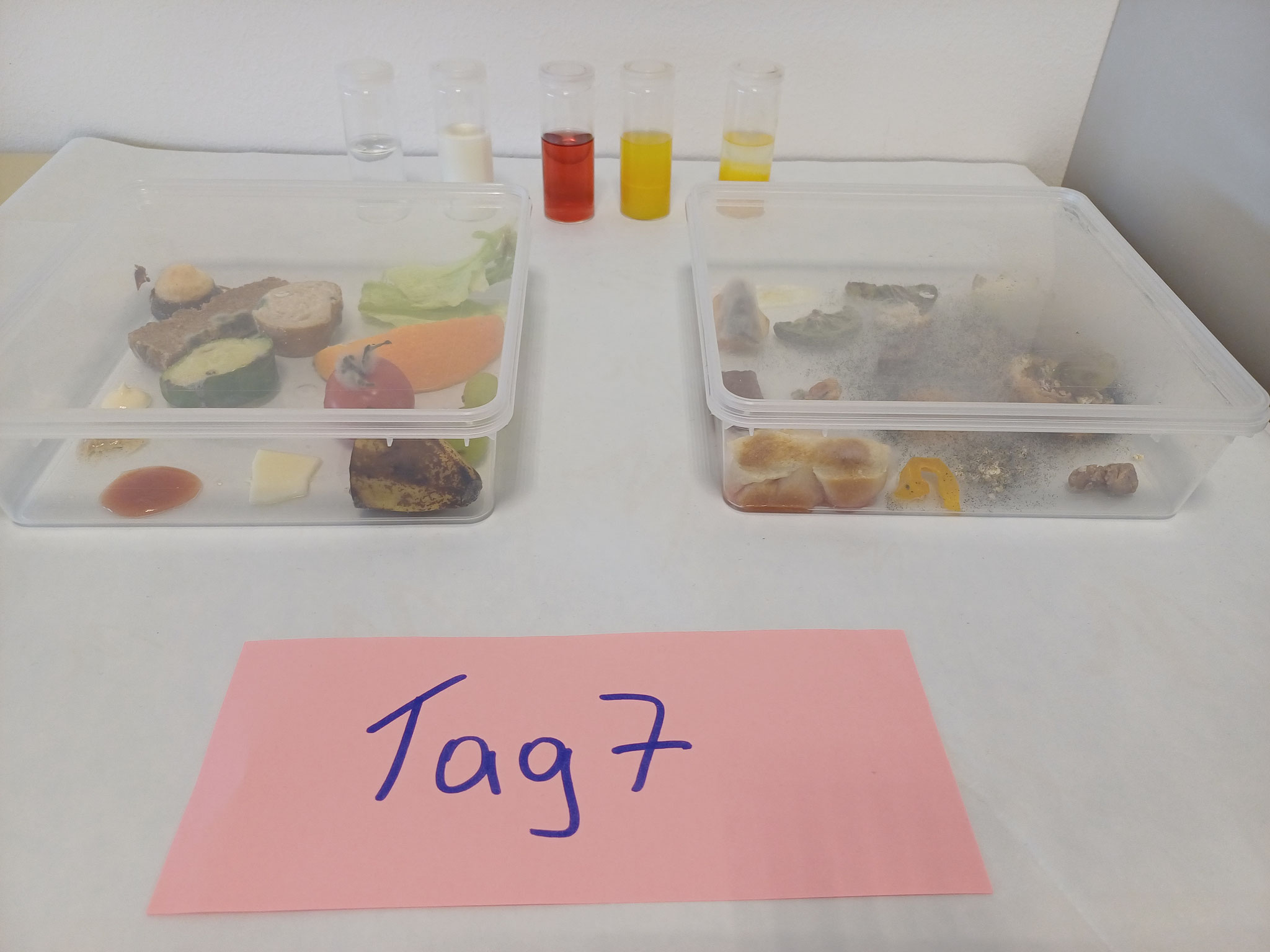 Um den Verderb von Lebensmitteln bei nicht sachgerechter Lagerung zu beobachten, wurden zwei Kunststoffboxen mit Lebensmittelproben befüllt. In die Boxen kamen: