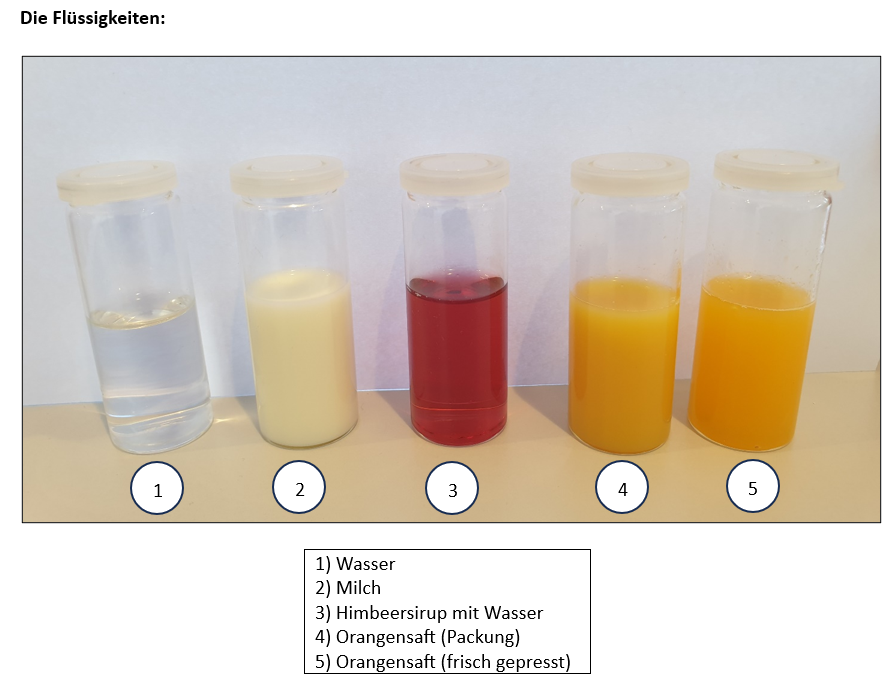 Zudem haben die Schüler:innen Schnappdeckelgläser mit Flüssigkeiten befüllt. Es wurden Milch, Himbeerverdünnungssaft, Orangensaft aus der Packung, frisch gepresster Orangensaft sowie eine Vergleichsprobe mit Leitungswasser zur Beobachtung bereitgestellt. Untersucht wurde, wie die Lebensmittel bei Raumtemperatur verderben und in welchem Zeitraum es zu einer sichtbaren Schimmelbildung kommt.
