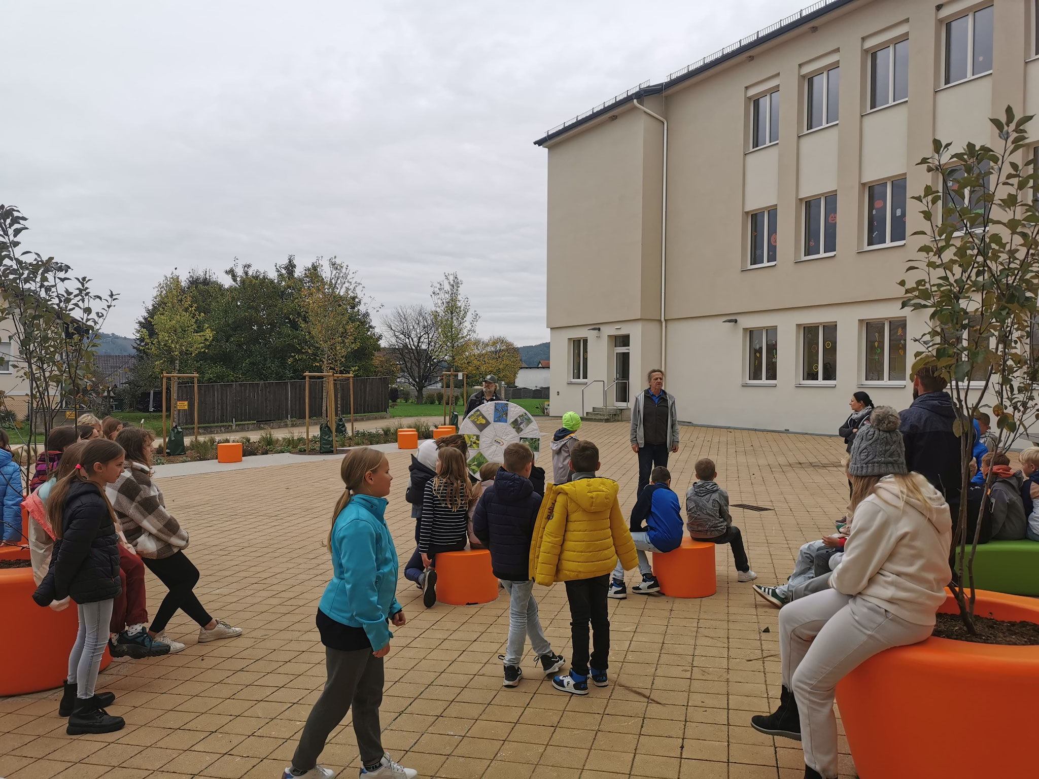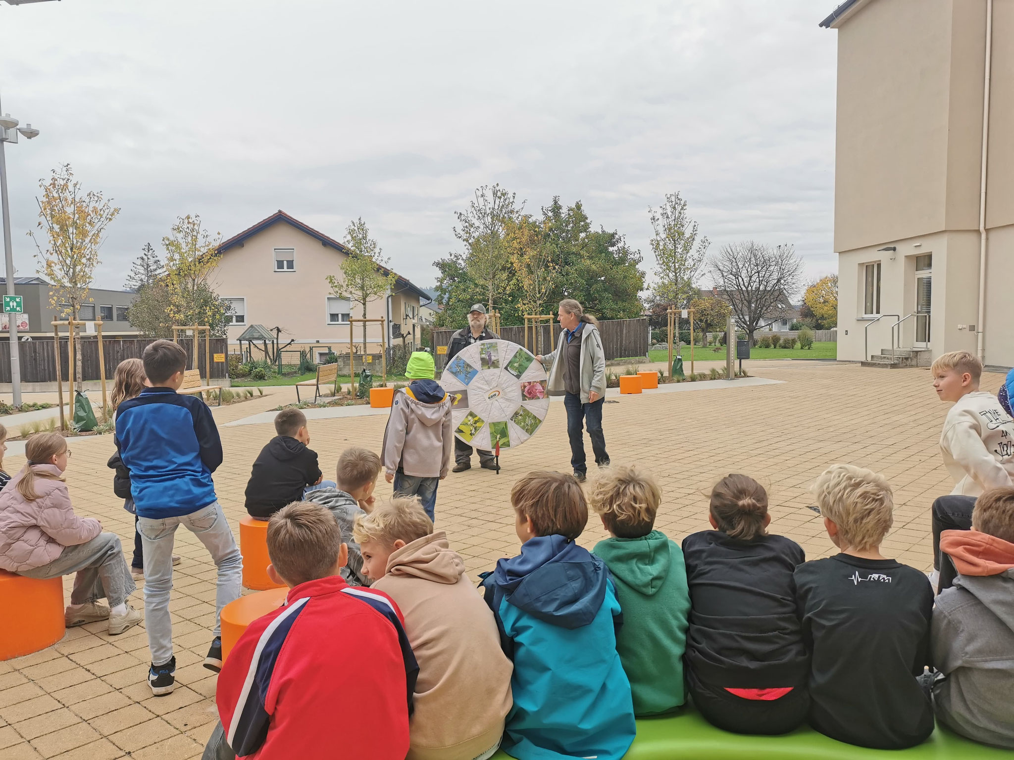 Ein Highlight war der Neophyten-Abschluss mit dem von Thomas mitgebrachten Neophyten-Rad, an dem die Kinder ihr neu gewonnenes Wissen testen konnten. Gemeinsam wurden die Arten durchbesprochen, darunter der japanische Staudenknöterich, die Robinie und das drüsige Springkraut. Besonders eindrucksvoll demonstrierte Thomas die Verbreitungsweise des drüsigen Springkrauts mithilfe einer Wasserrakete, die eine gefüllte Flasche nur durch Luftdruck weit in die Höhe schoss. Der begeisterte Applaus der Schüler:innen war ihm sicher.