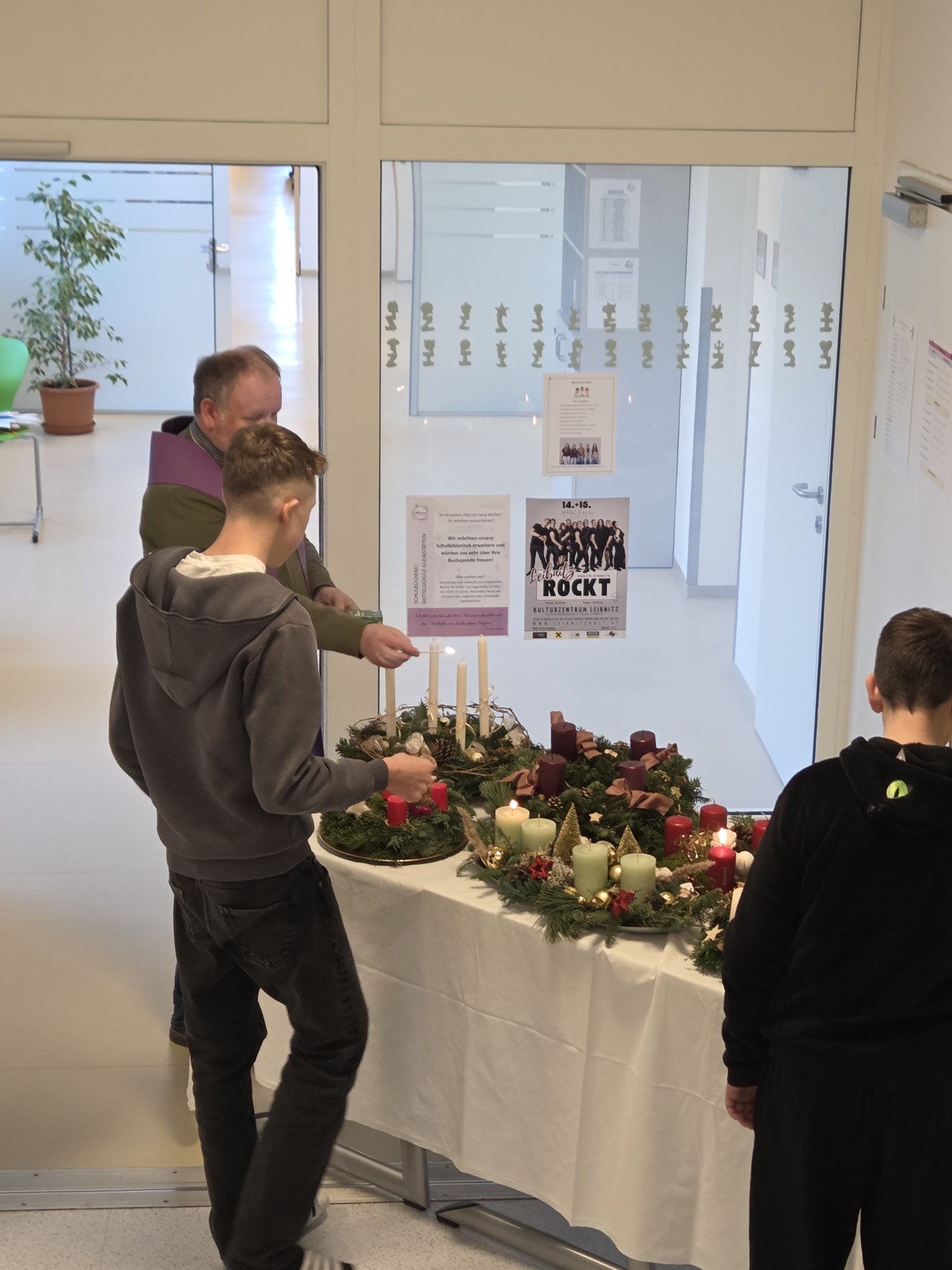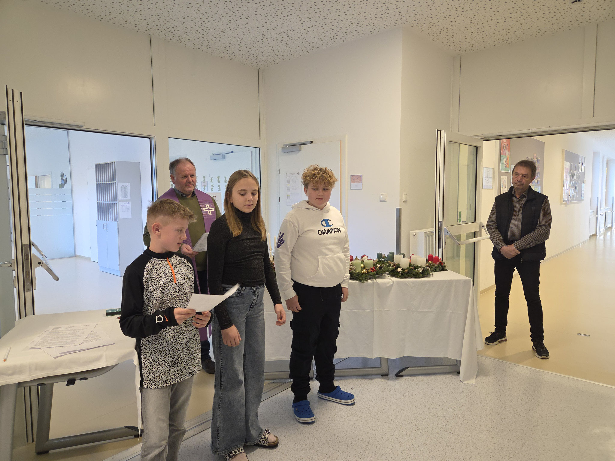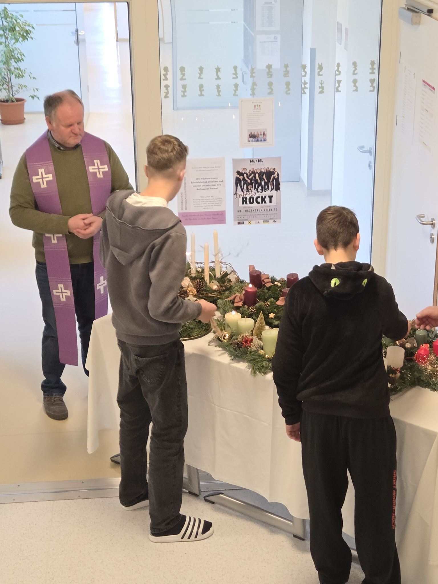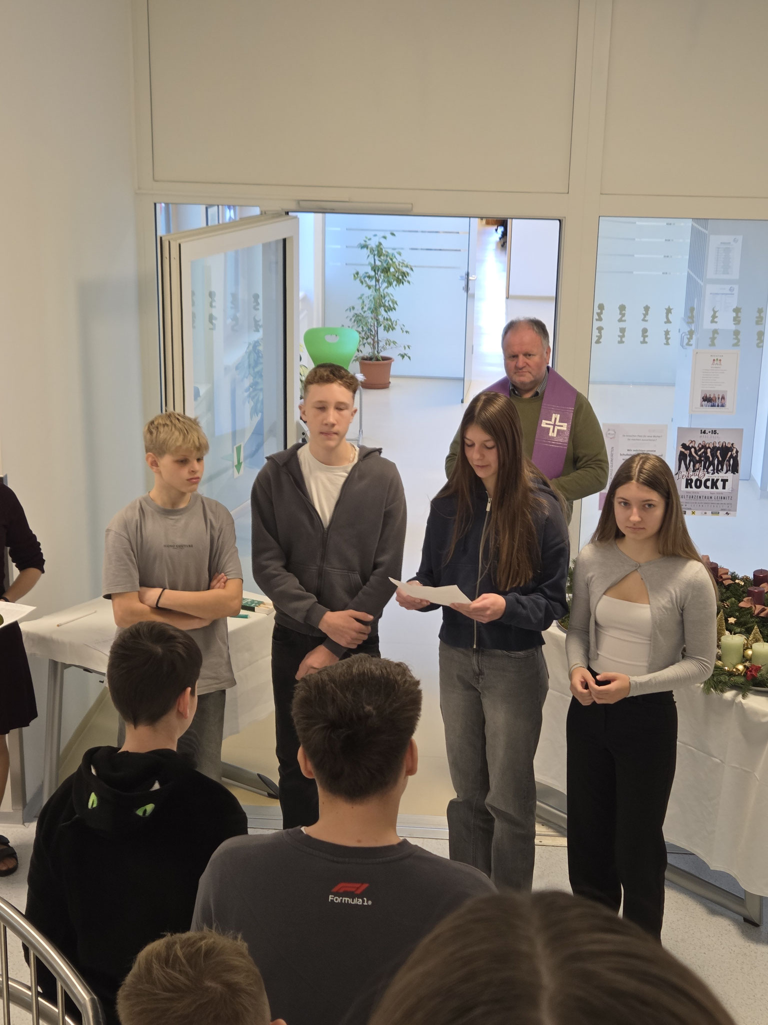 Die Klassensprecher:innen, ihre Stellvertreter:innen sowie die Schulsprecherin lasen Texte zur Entstehung und Bedeutung des Adventkranzes und Fürbitten vor, welche von Frau Döller vorbereitet wurden.