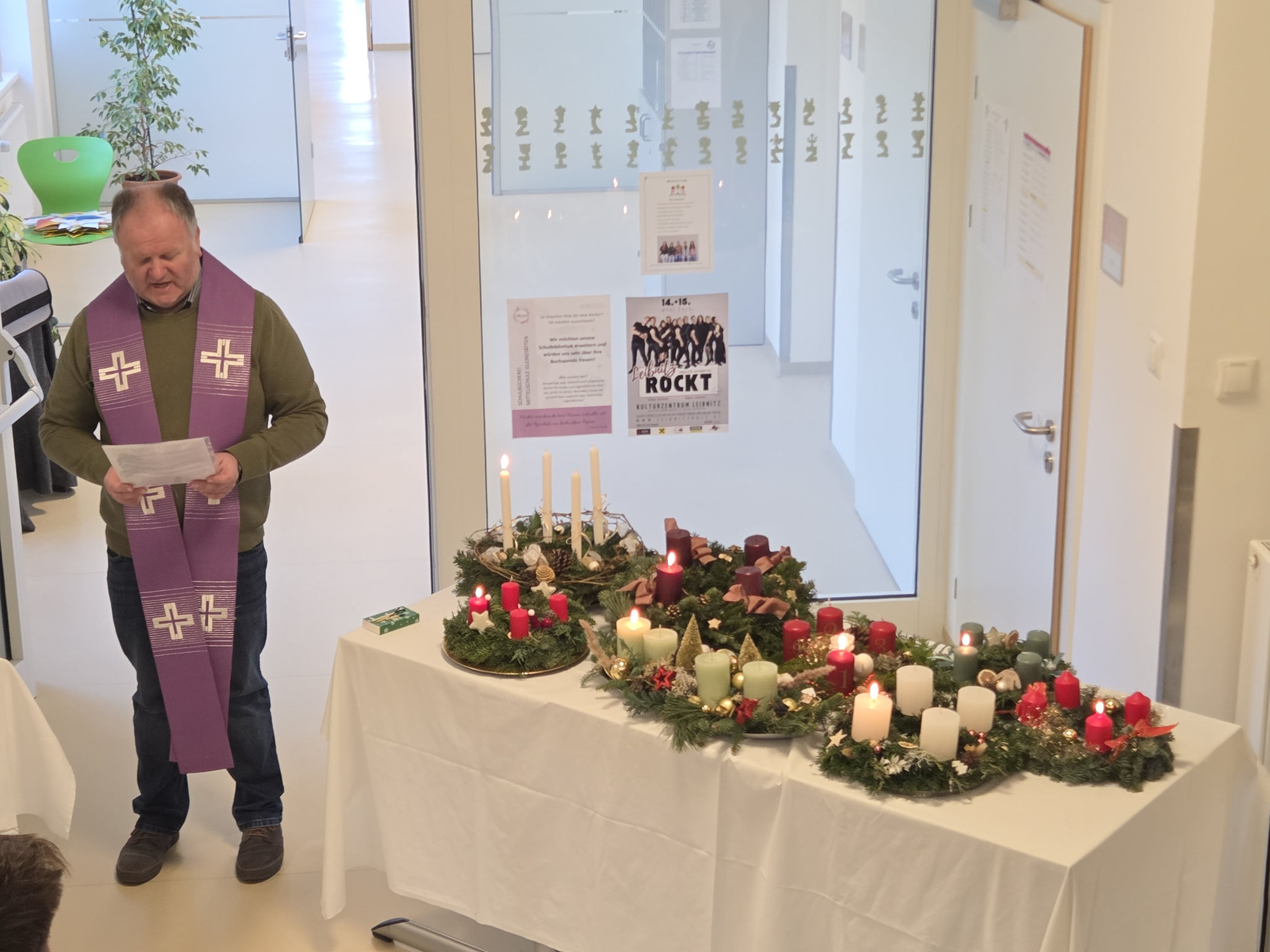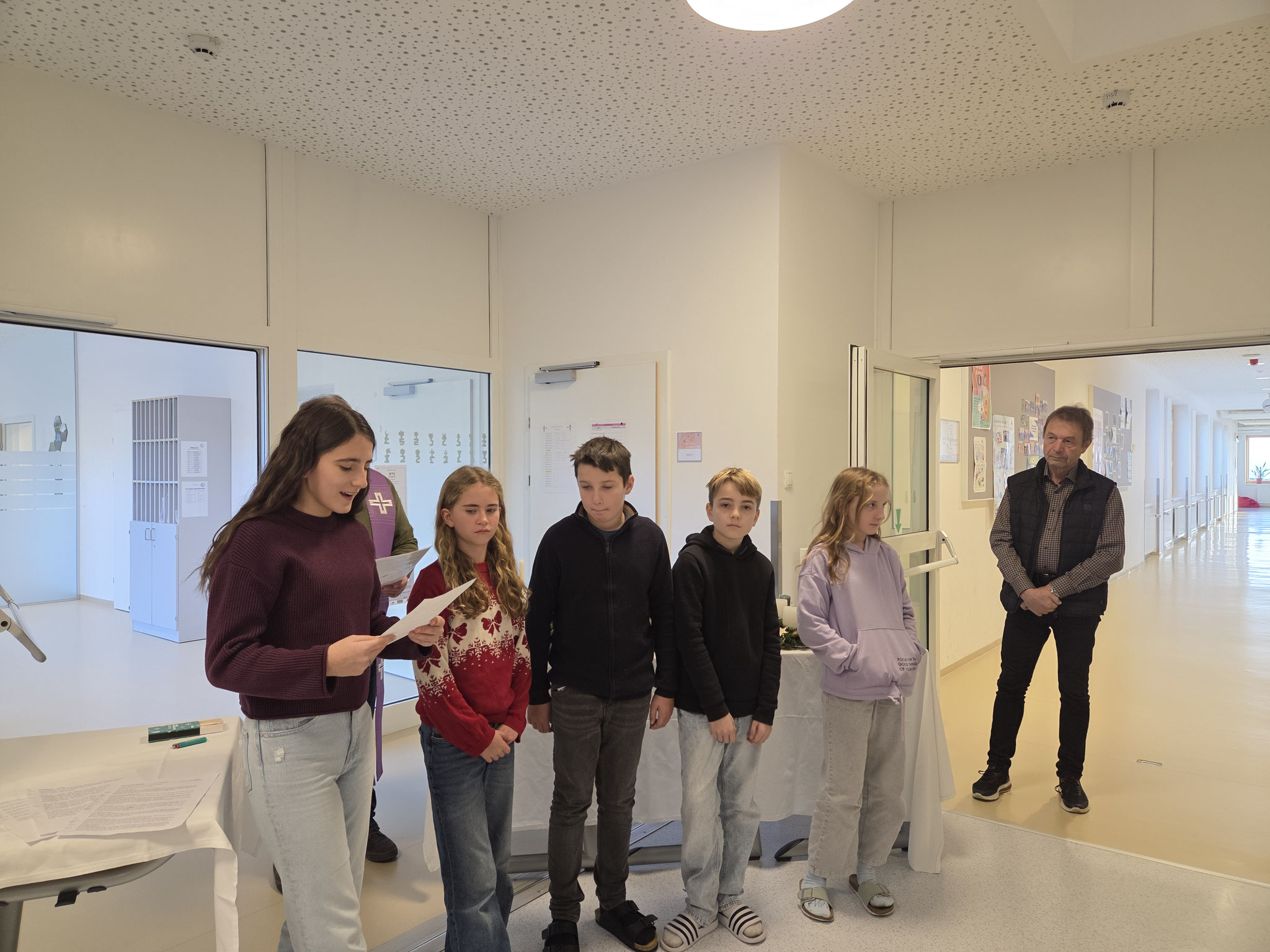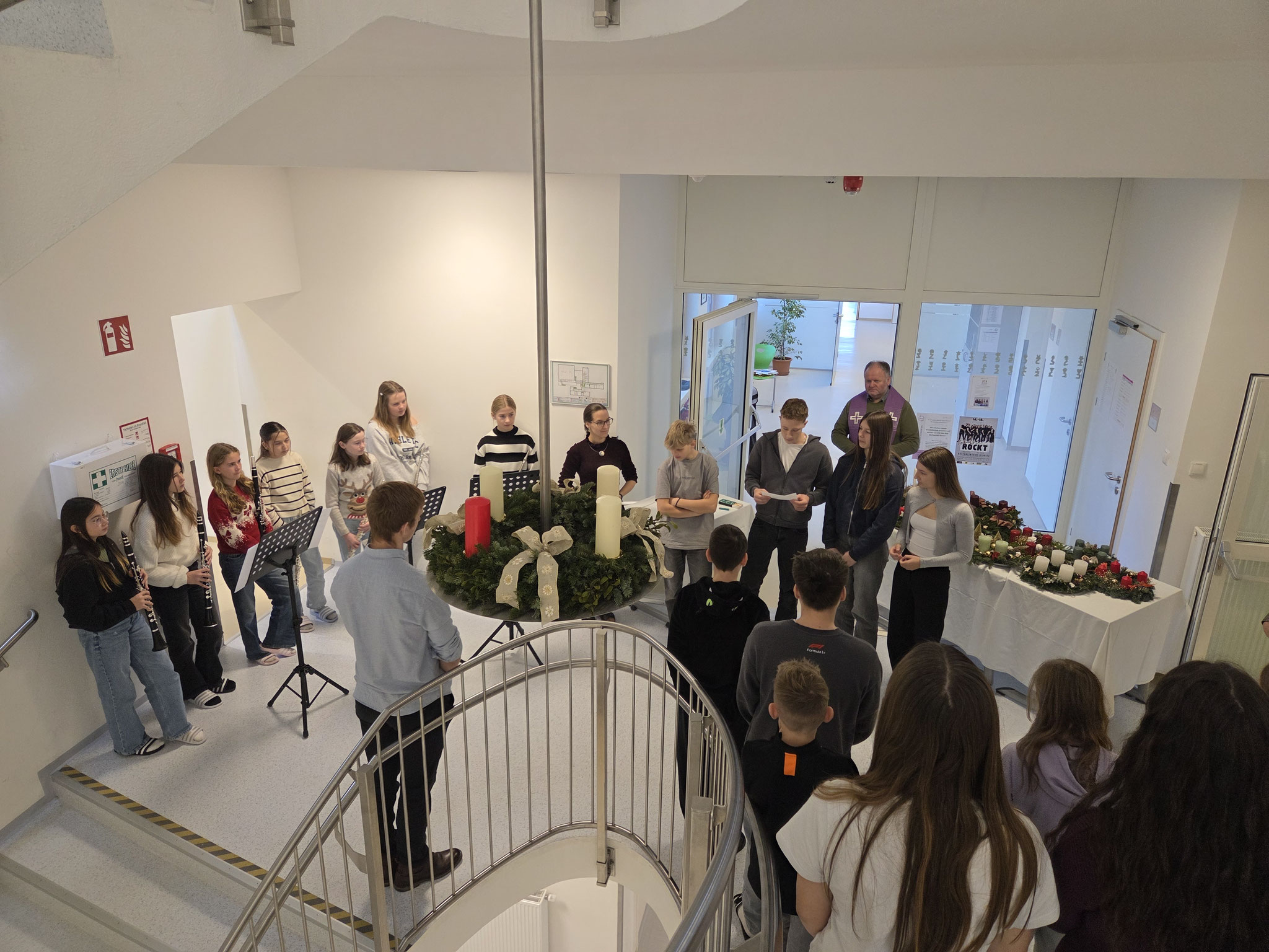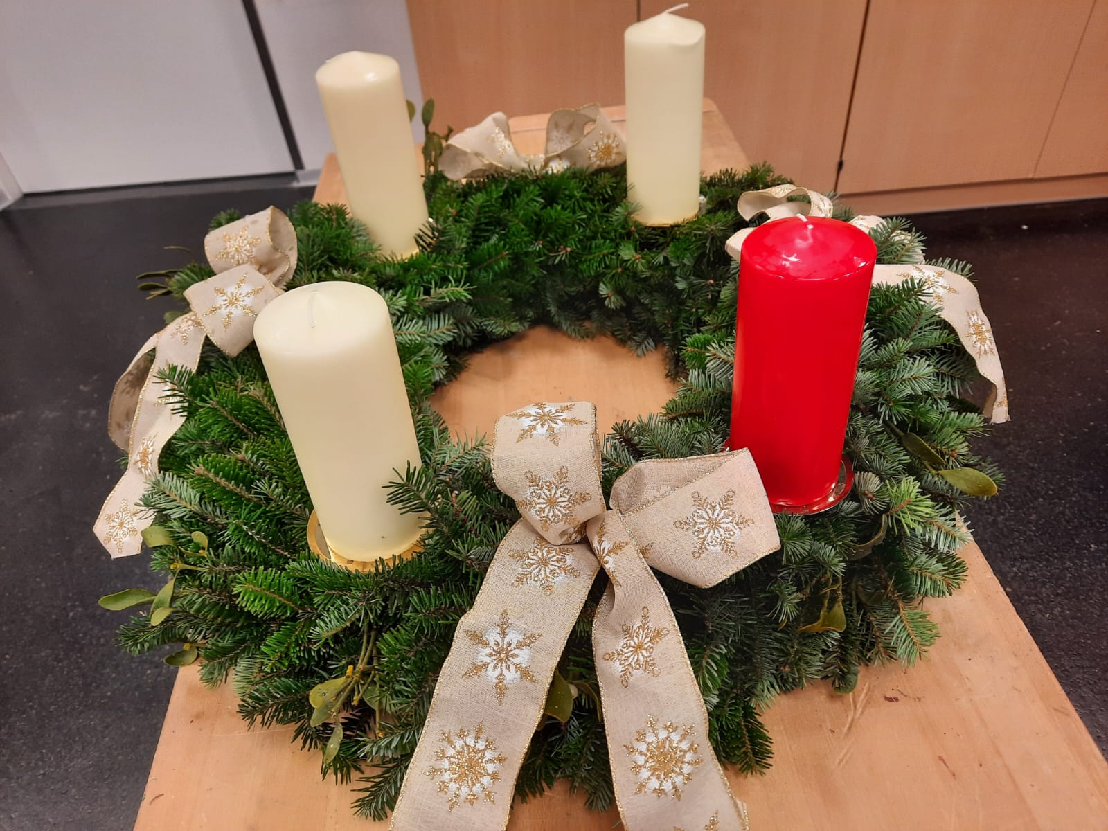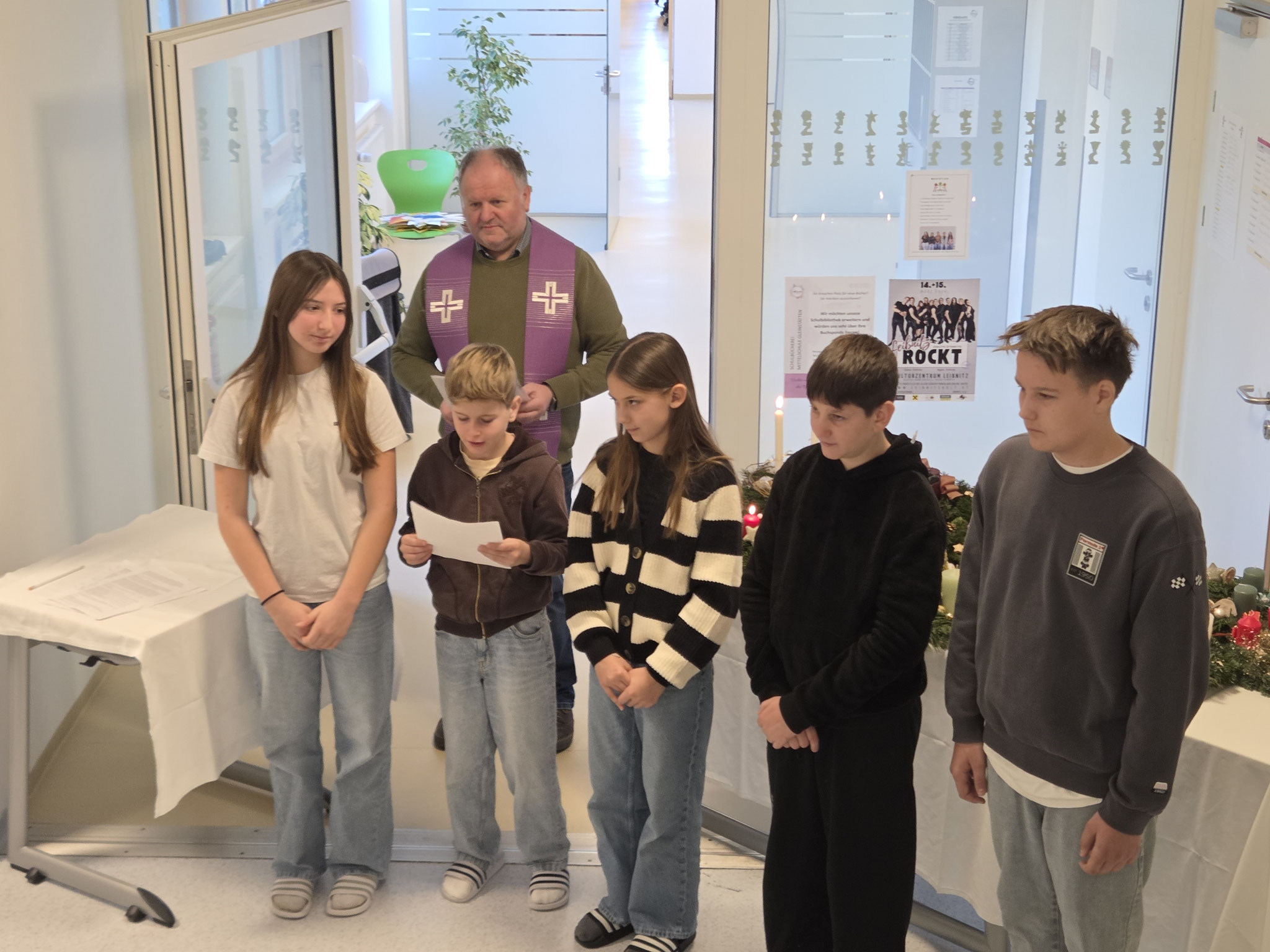 Die Klassensprecher:innen, ihre Stellvertreter:innen sowie die Schulsprecherin lasen Texte zur Entstehung und Bedeutung des Adventkranzes und Fürbitten vor, welche von Frau Döller vorbereitet wurden.