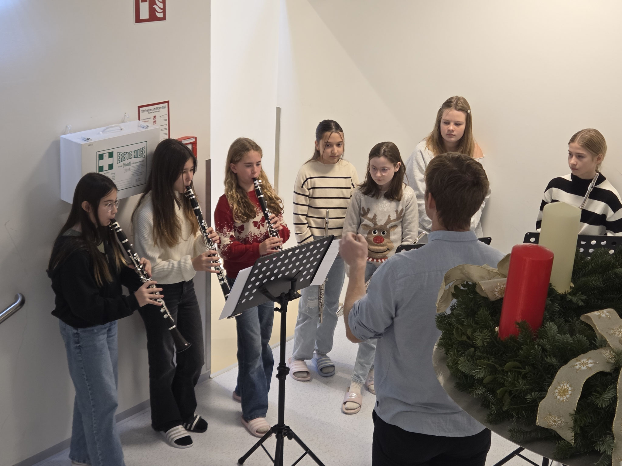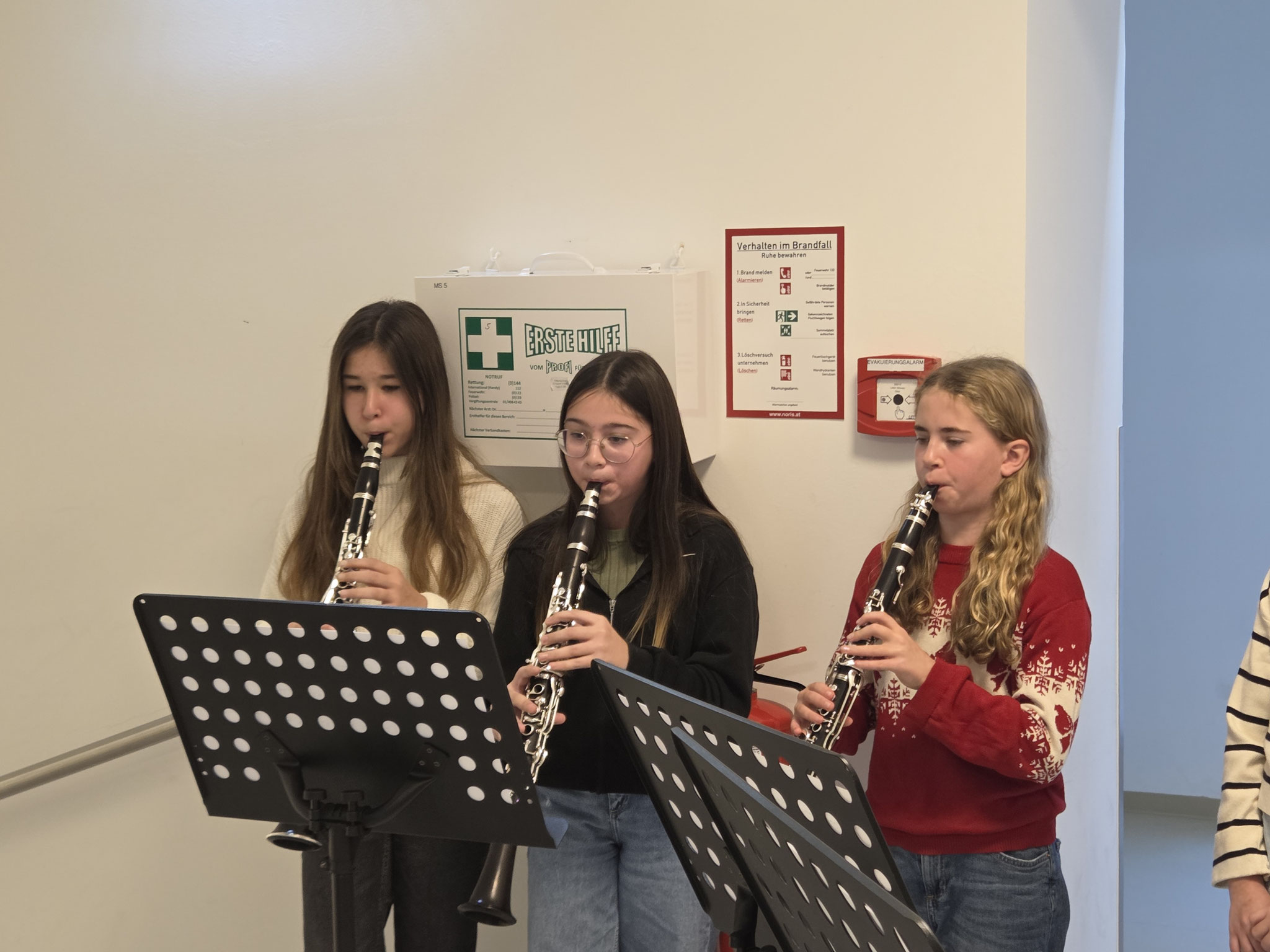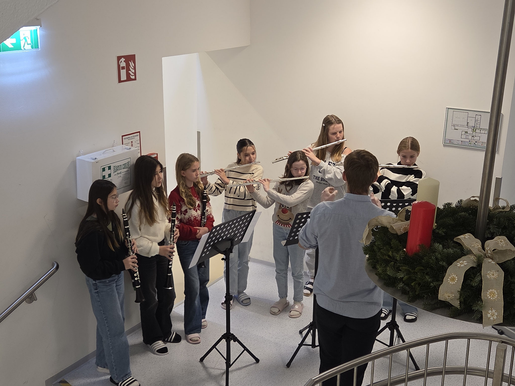 Herr Dietrich organisierte ein Querflöten- und ein Klarinettenensemble mit Schülerinnen aus den 1.-4. Klassen, welche für eine besonders vorweihnachtliche Stimmung sorgten.