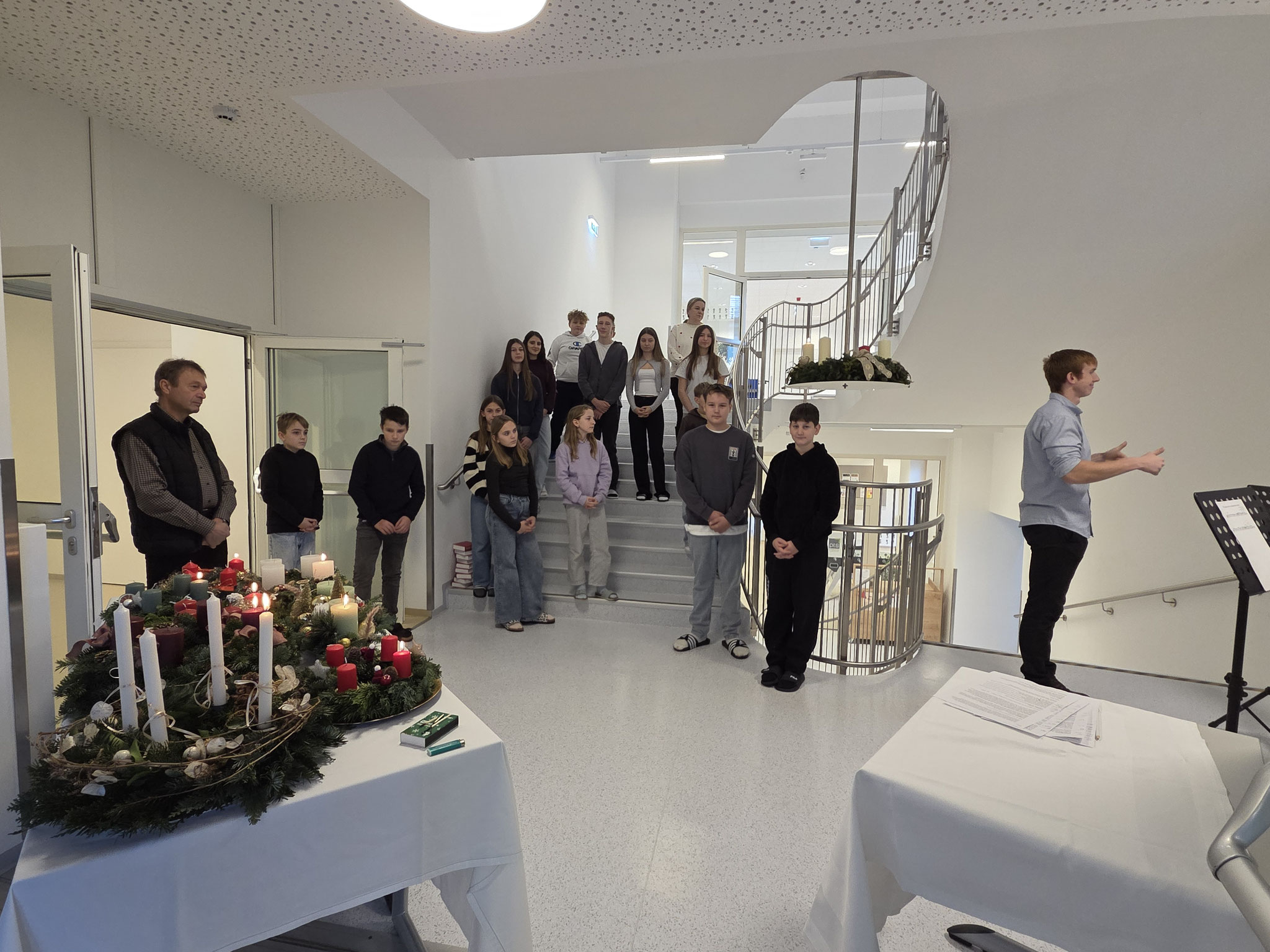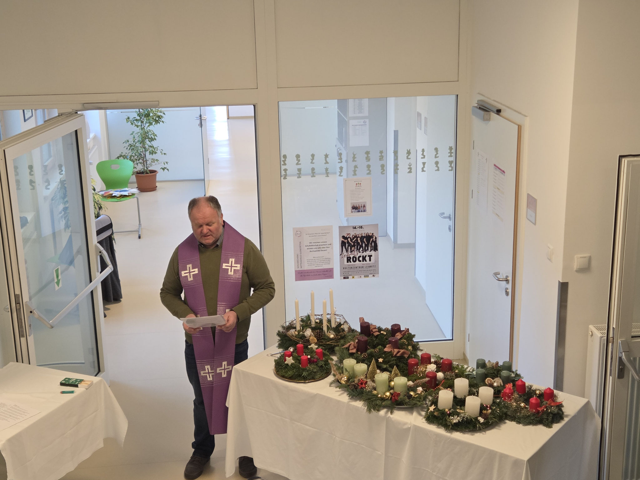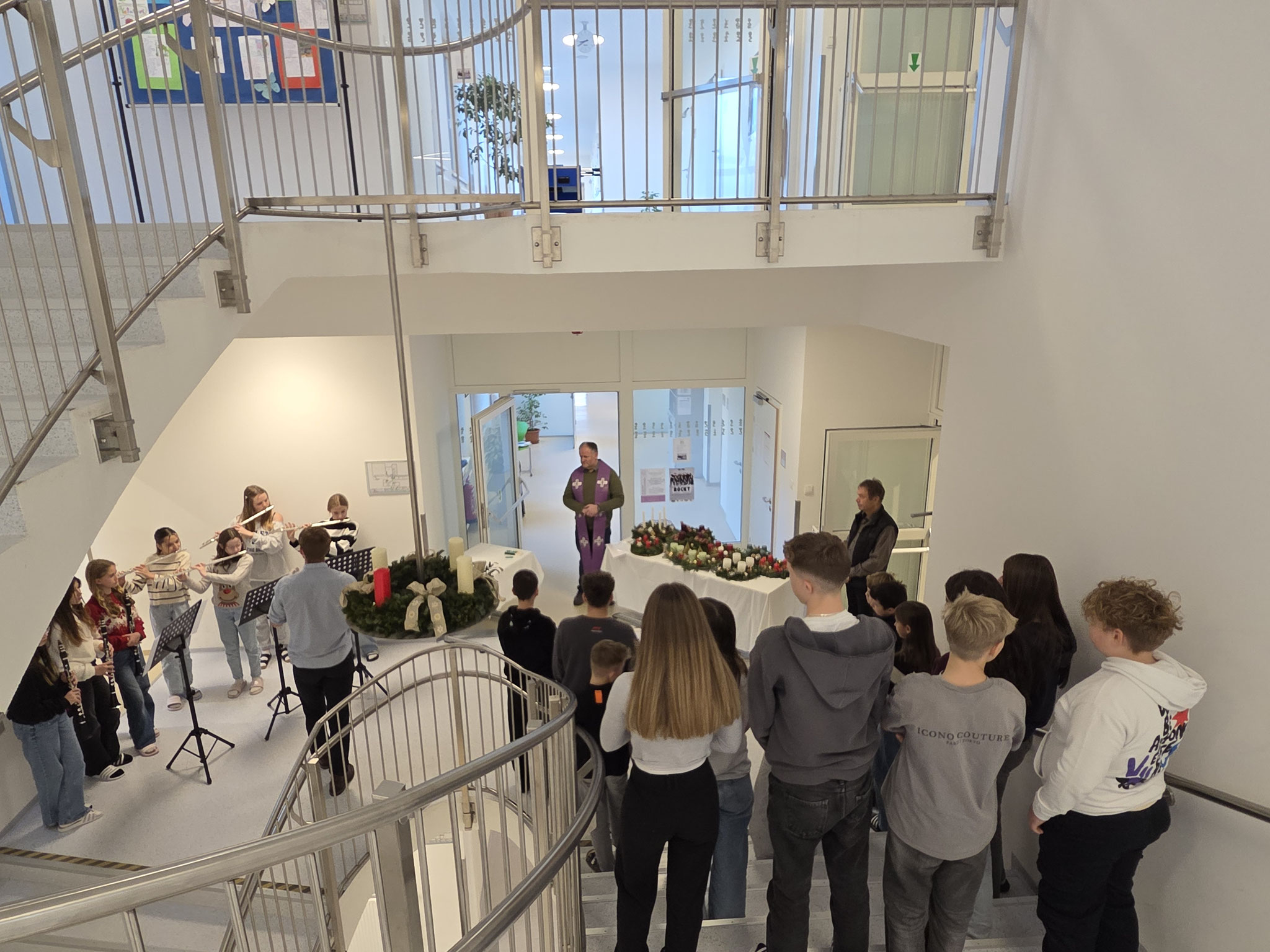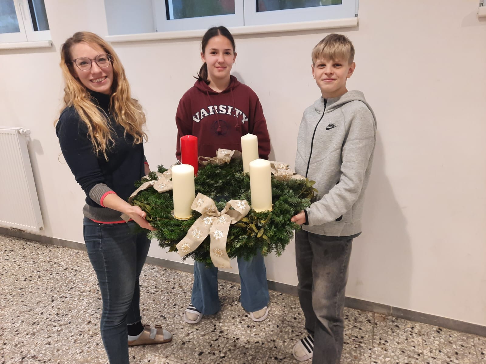 Am Freitag, den 28. November 2025, fand in der Mittelschule Gleinstätten die traditionelle Adventkranzsegnung mit Pfarrer Mag. Fötsch statt. Der große Adventkranz im Stiegenhaus der Mittelschule wurde von Frau Engel, Frau Riegler und Schüler:innen aus der 3a gebunden und gestaltet. Zusätzlich segnete unser Pfarrer für jede Klasse einen eigenen schön gestalteten Adventkranz.