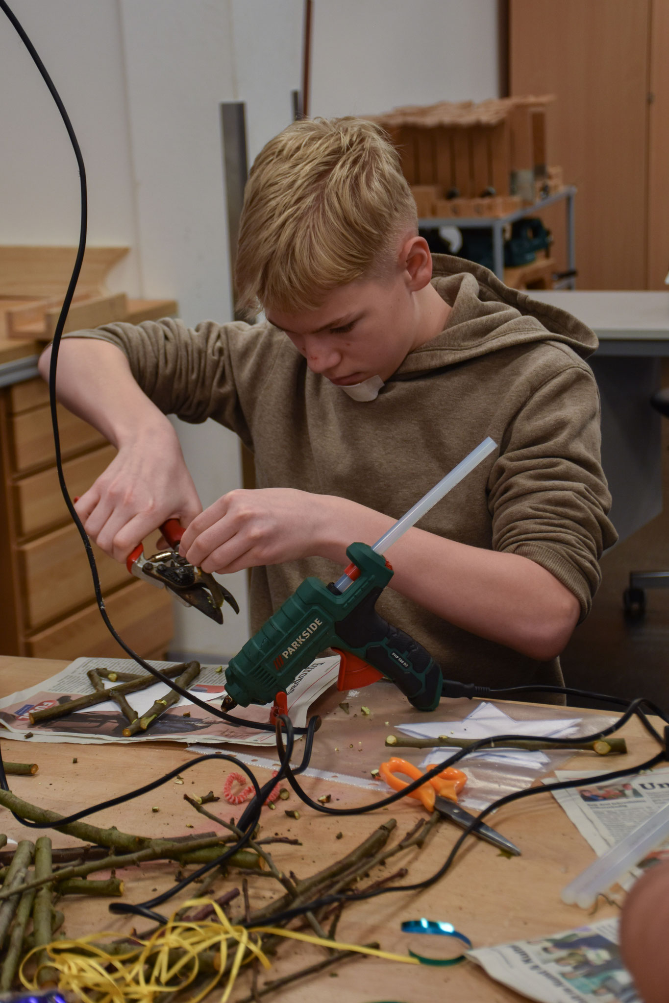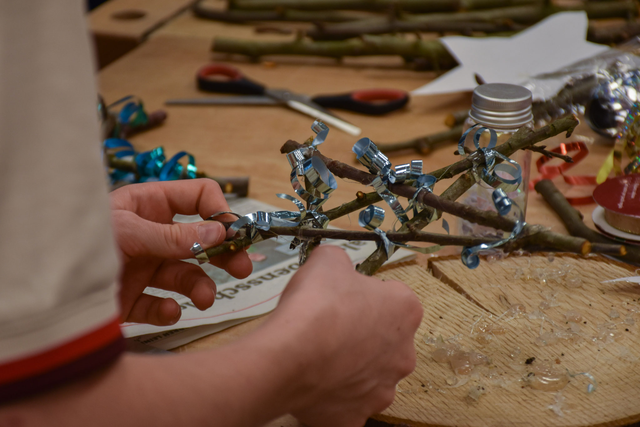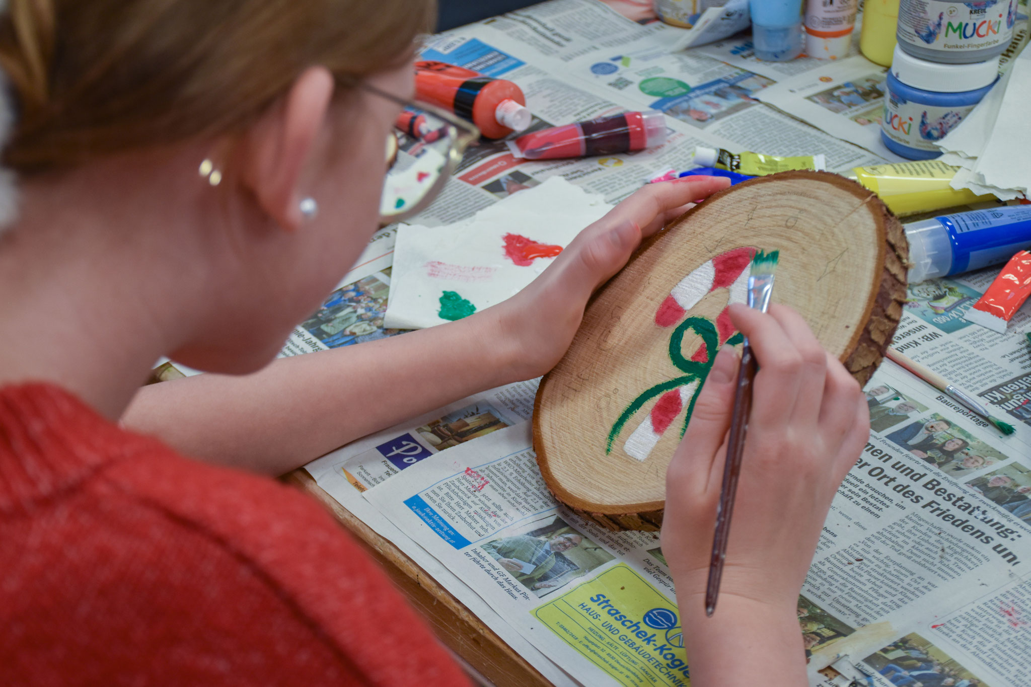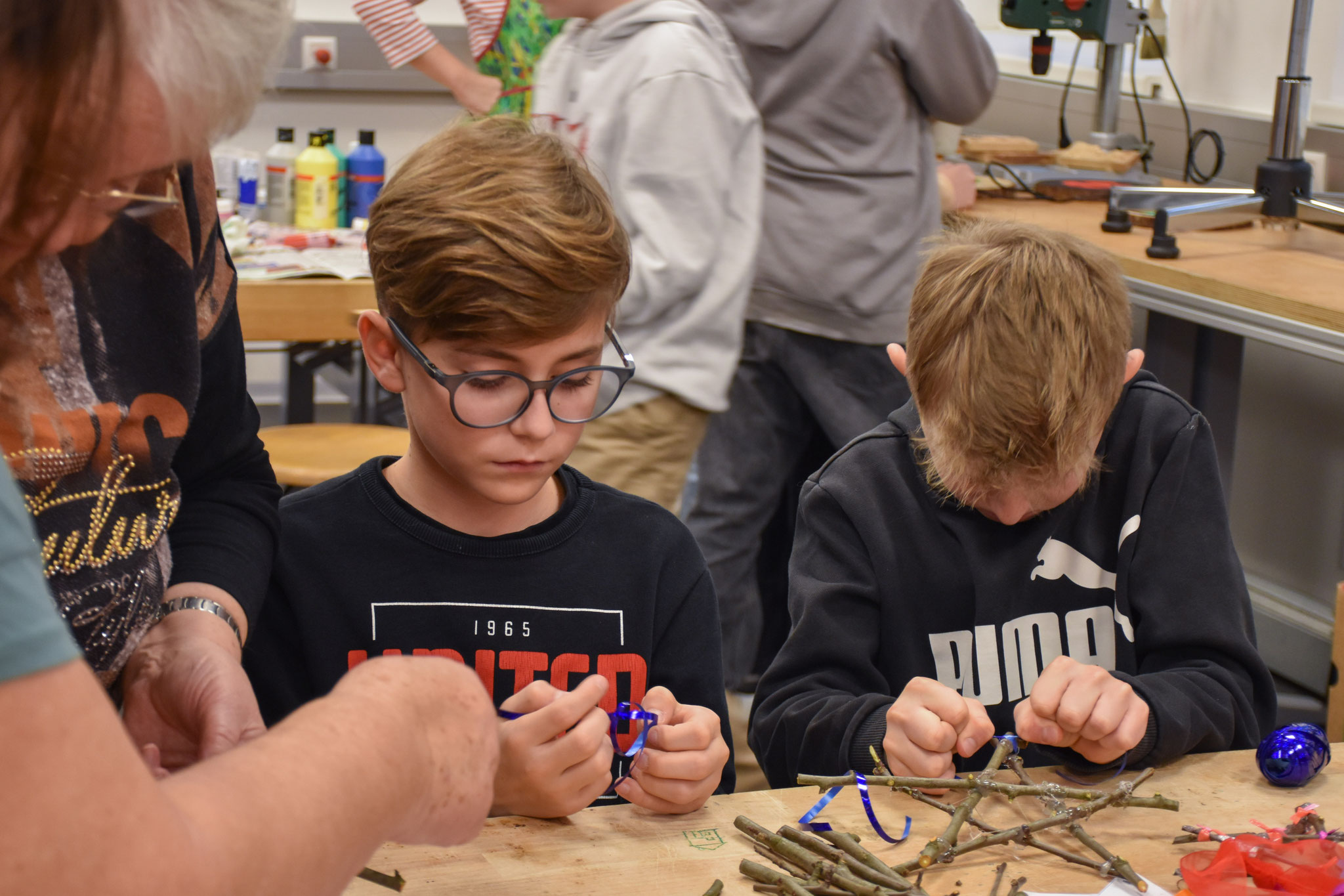 Hier ging es handwerklich zu. Aus Ästen wurden schlichte, schöne Sterne gebunden und mit bunten Bändern geschmückt. Außerdem entstanden Holzanhänger, umwickelt mit Wolle oder bemalt mit Acrylfarben. Eine Station, die viel Raum für Kreativität ließ.