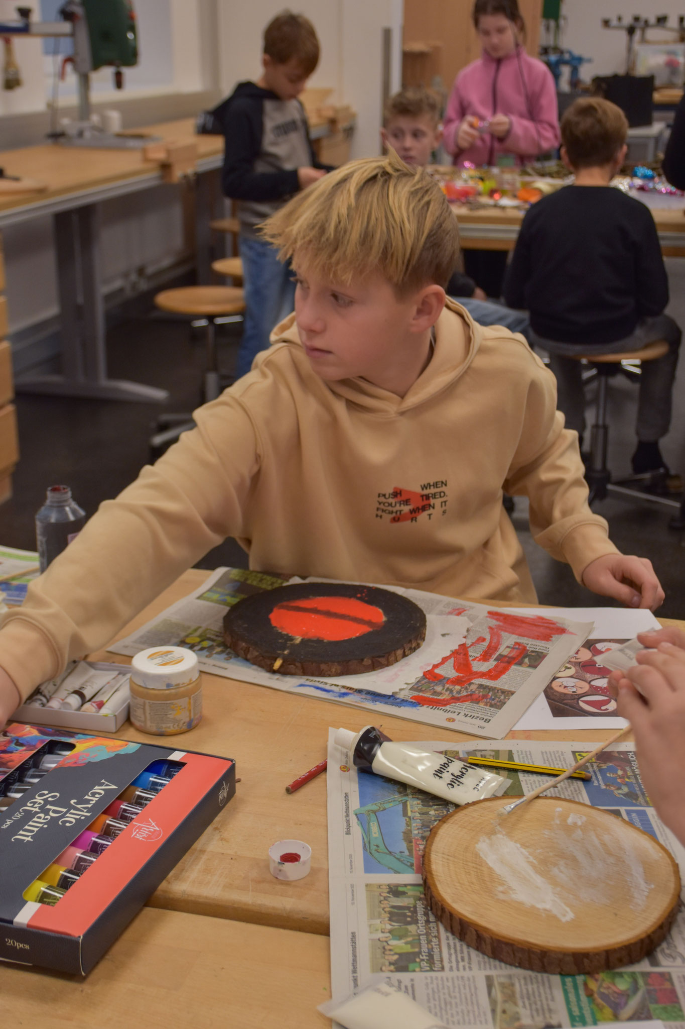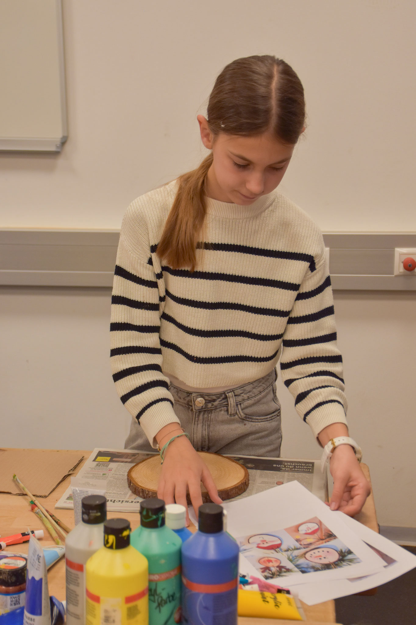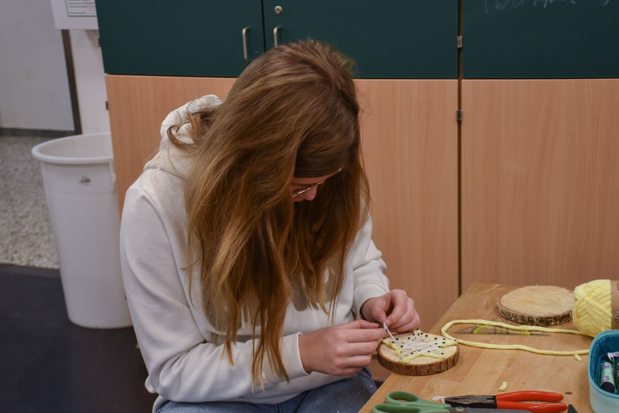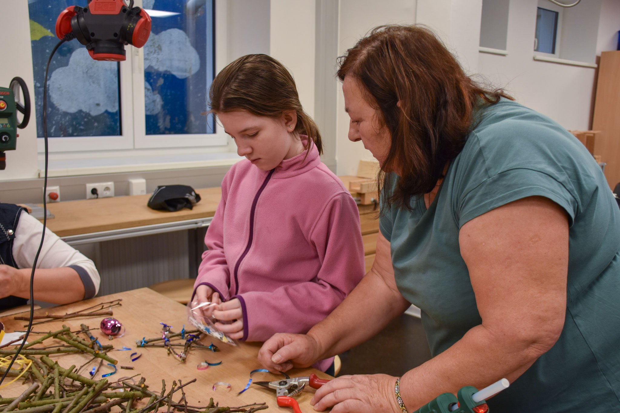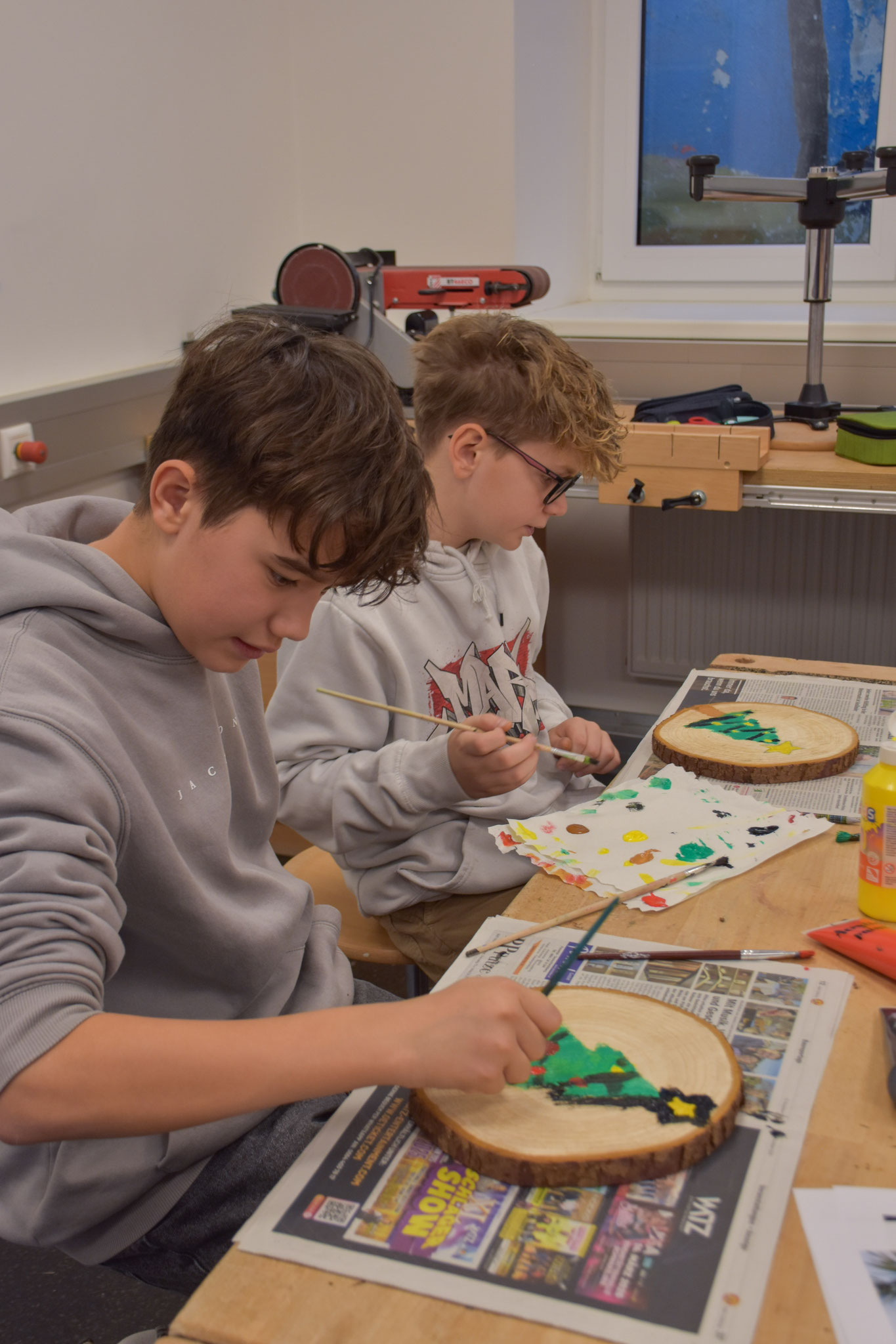 Hier ging es handwerklich zu. Aus Ästen wurden schlichte, schöne Sterne gebunden und mit bunten Bändern geschmückt. Außerdem entstanden Holzanhänger, umwickelt mit Wolle oder bemalt mit Acrylfarben. Eine Station, die viel Raum für Kreativität ließ.