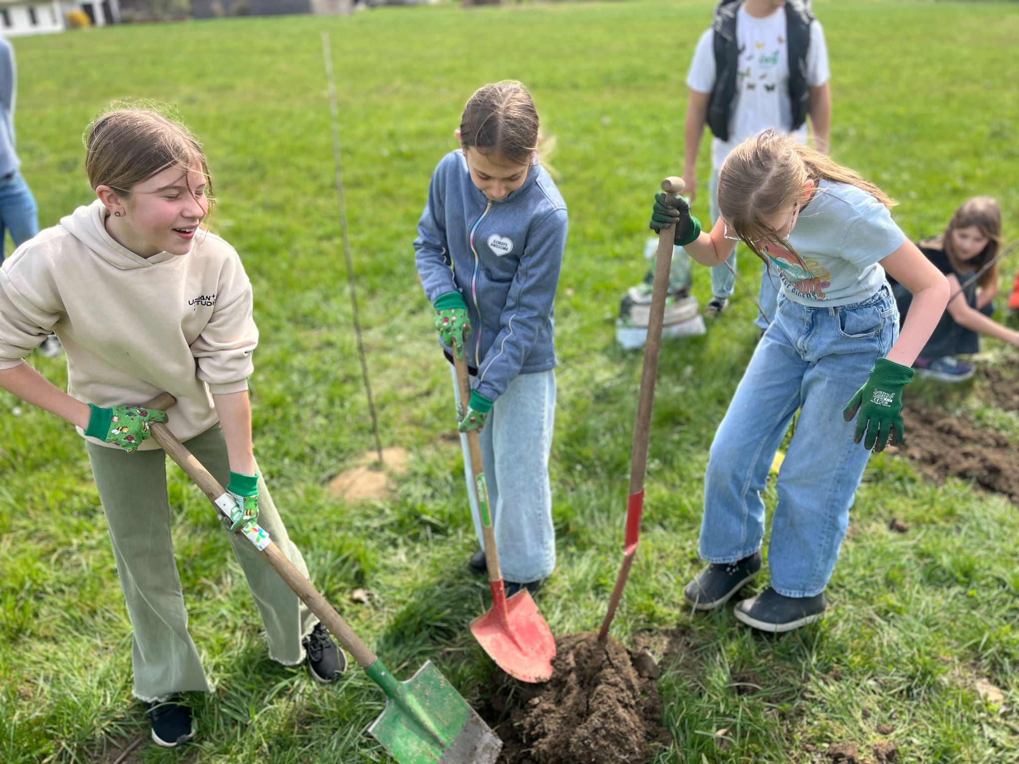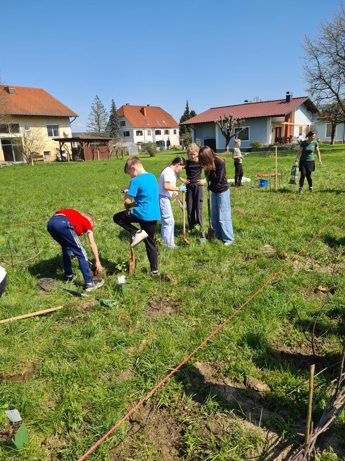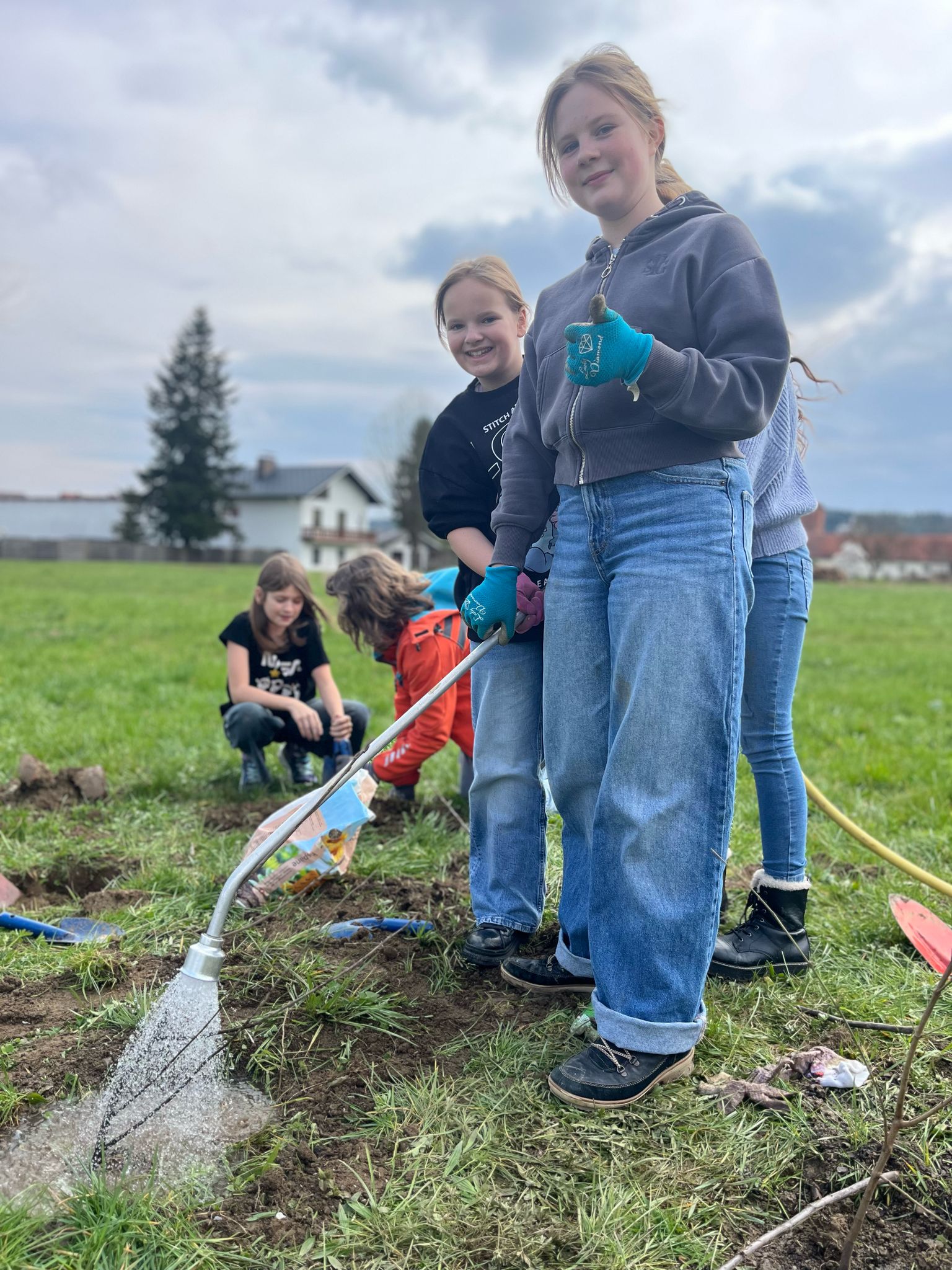 Neben der Heckenpflanzung beschäftigten sich die Kinder auch mit der Gestaltung eines Blumenecks. Dabei wurden Blumenzwiebeln eingepflanzt, die in den kommenden Monaten zu wunderschönen Blumen heranwachsen werden. Die Schüler:innen lernten, welche Blumen besonders bienenfreundlich sind und warum es wichtig ist, solche Pflanzen zu setzen, um die Artenvielfalt zu fördern und den Tieren Nahrung zu bieten.