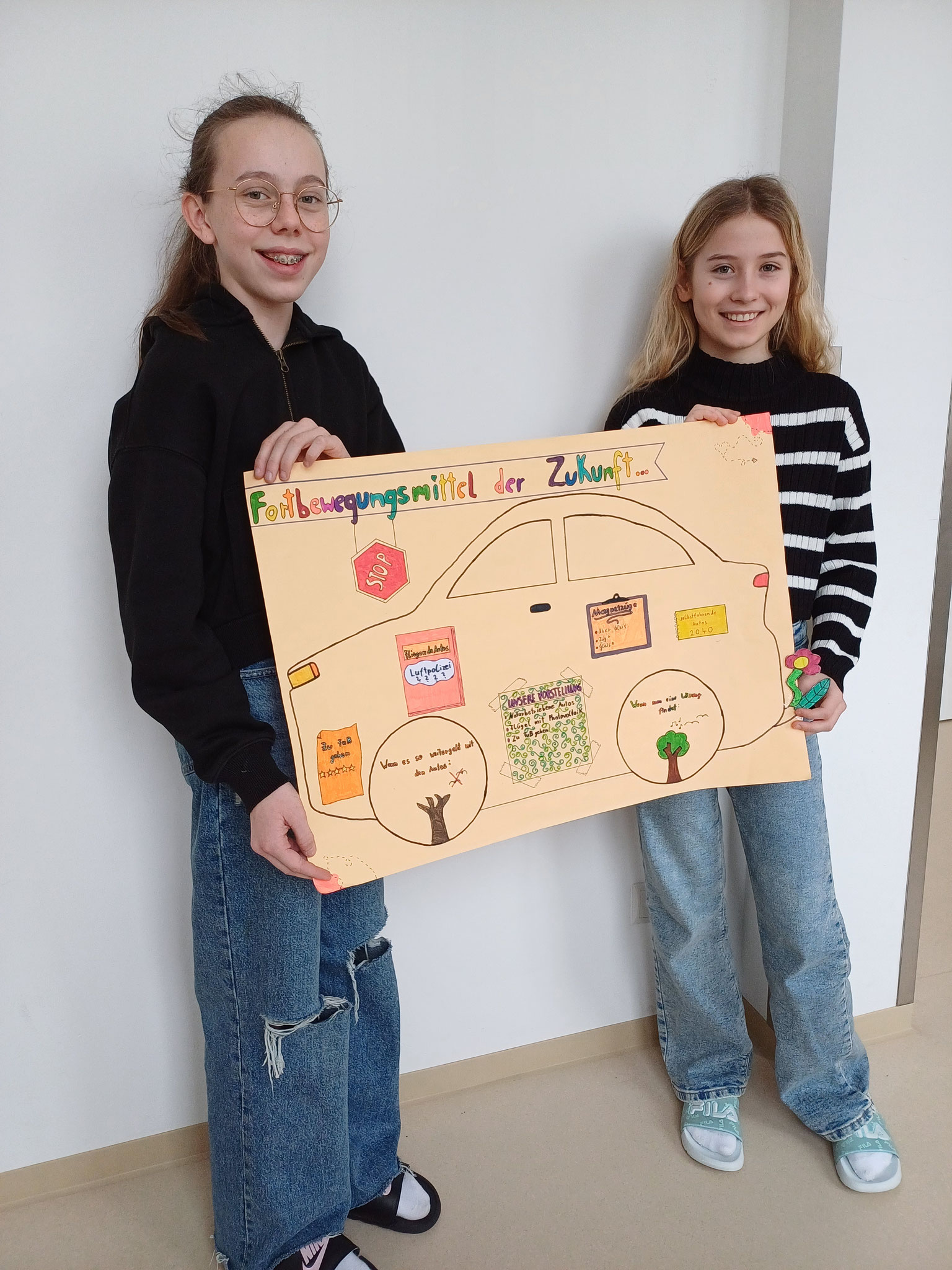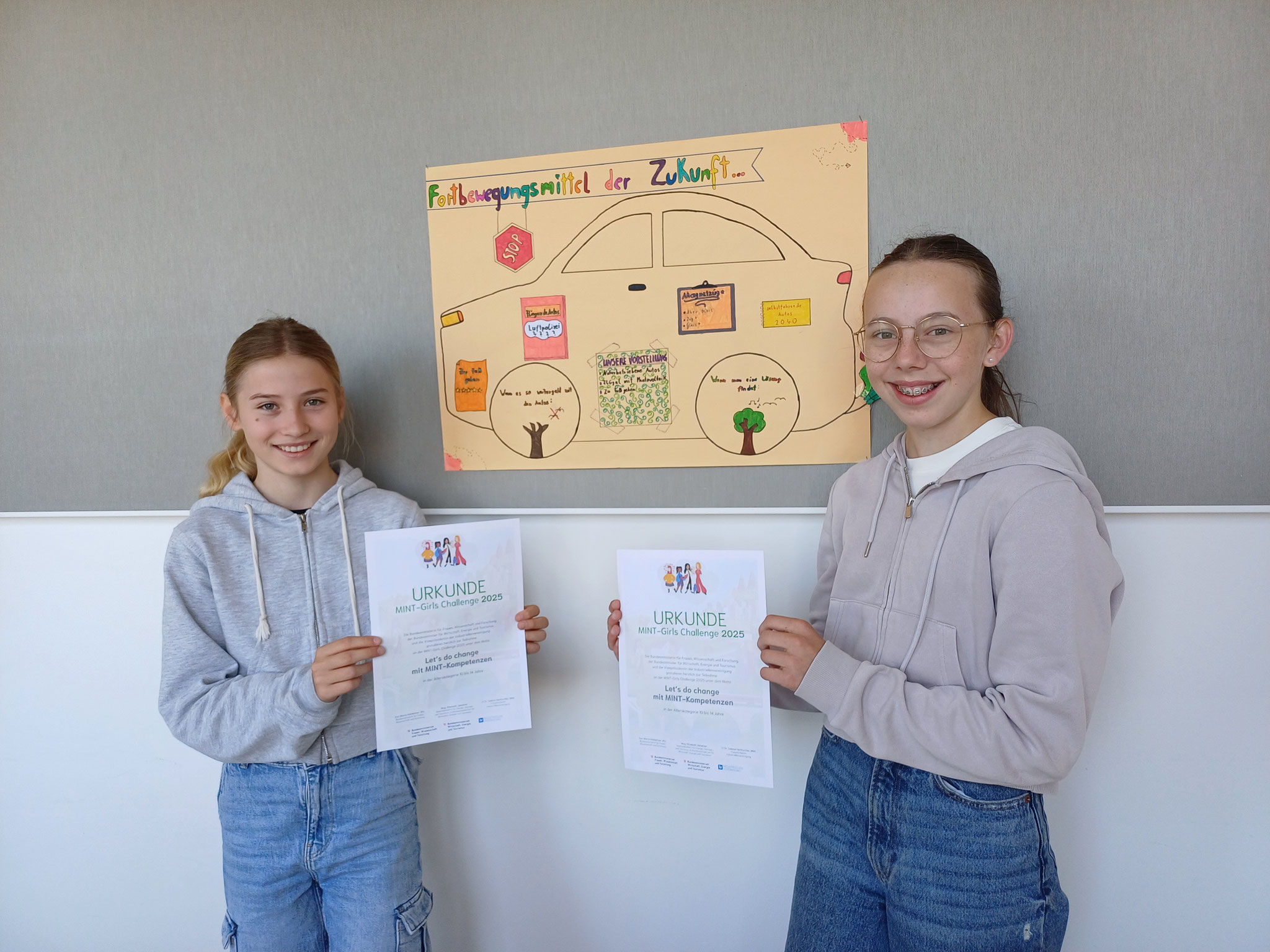 Die dabei entstandene Arbeit von Carina Wildpacher und Emma Orgl aus der 3b Klasse wurde bei der MINT Girls Challenge 2024/25 eingereicht. Die Bundesministerin für Frauen, Wissenschaft und Forschung, der Bundesminister für Wirtschaft, Energie und Tourismus, sowie die Industriellenvereinigung Österreich haben diesen Wettbewerb ins Leben gerufen. Zum Thema „Fortbewegungsmittel der Zukunft“ wurde ein Text verfasst und ein Plakat gestaltet. Die Ideen der beiden Schüler:innen wurden im Rahmen einer Präsentation der Klasse vorgestellt. Die beiden SchülerInnen erhielten eine Urkunde für die Teilnahme an der MINT Girls Challenge unter dem Motto „Let´s do change mit MINT-Kompetenzen“.