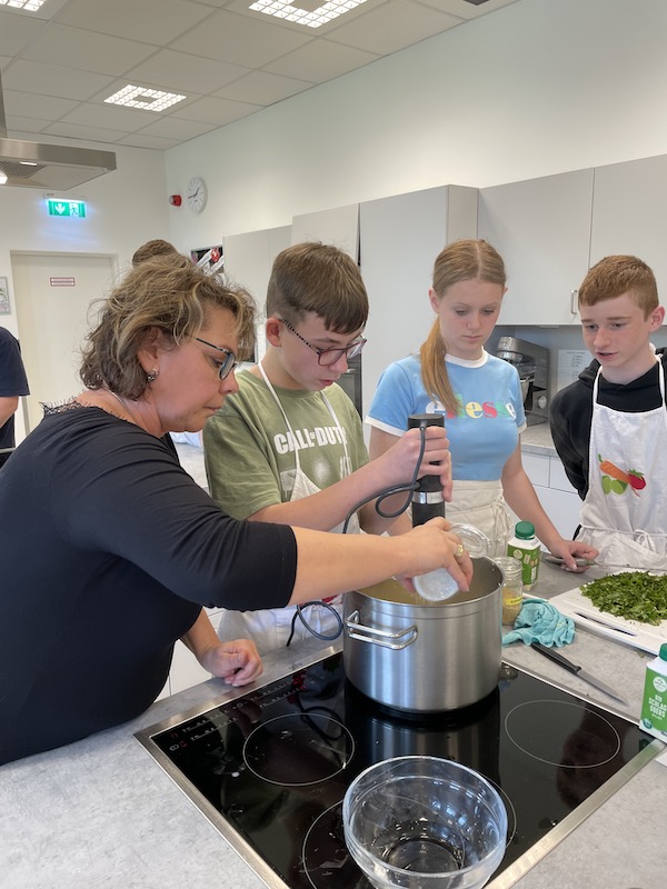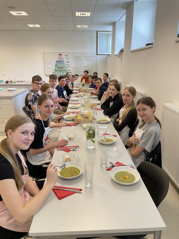 Unsere 4. Klassen hatten in den letzten Wochen die Möglichkeit, eine Einheit des EH-Unterrichts mit einer diplomierten Kräuterpädagogin zu verbringen. Frau Renate Aldrian zeigte den Schülerinnen und Schülern im Zuge einer kurzen Kräuterwanderung sehr wichtige Wild- und Heilkräuter und wesentliche Bestimmungsmerkale. Diese wurden dann auch gesammelt und in der Schulküche genauer besprochen. Dass Kräuter auch sehr gut schmecken können, erfuhren die Jugendlichen gleich am eigenen Leib. Die gesammelten Pflanzen wurden zu einer Brennnesselsuppe, einer Wildkräutersuppe und zwei köstlichen Aufstrichen verarbeitet. Beifuß, Schafgarbe, Giersch und Co sind für unsere Schülerinnen und Schüler nun keine Fremdwörter mehr.